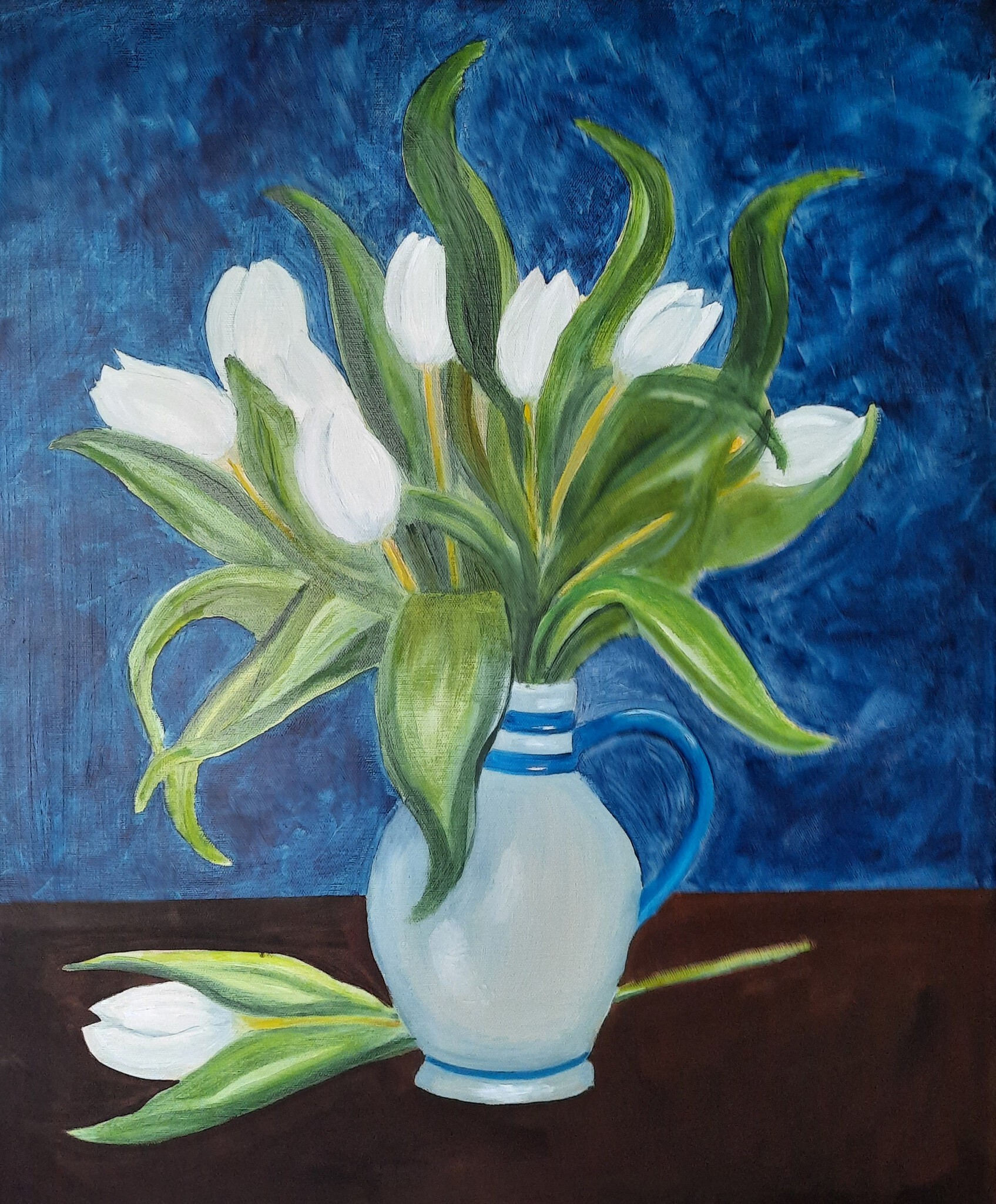 Witte tulpen in vaas geschilderd op doek. Expositie Sint Jozefoord van Kunstkring De Meent te Nuland thema bloemen 22 maart t/m 21 juni 2021