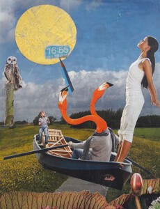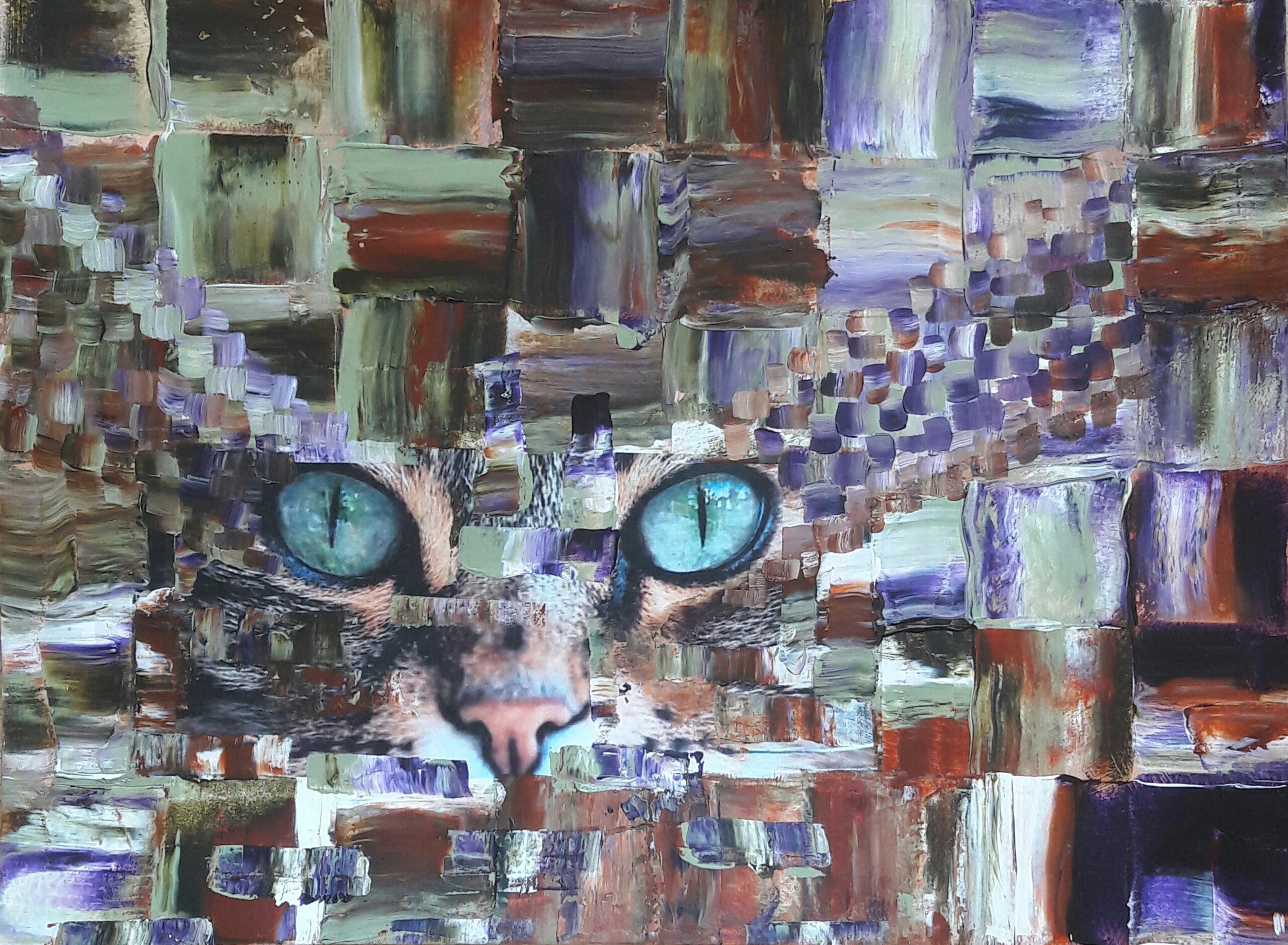 gemaakt voor een kattenliefhebber. collage en acrylverf, grotendeels met paletmes
