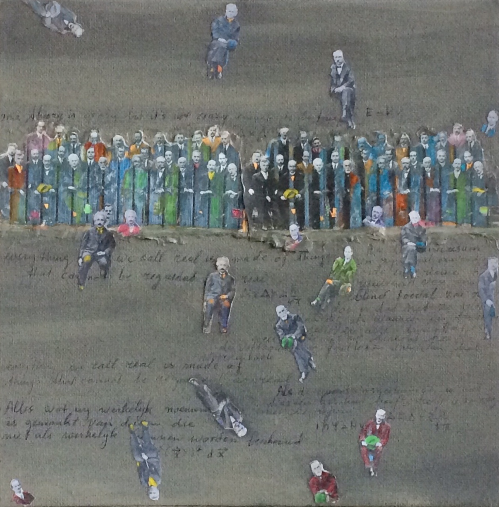 conferentie van fysici gehouden in 1927 Fotocollage en acryl op karton/doek