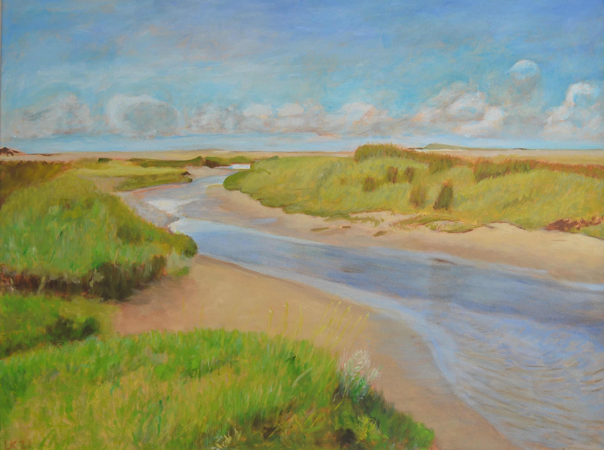 3 Jaar geleden was ik op Tessel. Daar was ik onder de indruk van het natuurlijke landschap van de Slufter wat me aangezet heeft tot het maken van dit schilderij. Ik ben begonnen met acryl om de transparantie van deze verf uit te proberen, maar ben later toch met olieverf doorgegaan. Met name de voorgrond kreeg ik niet mooi met acryl.
