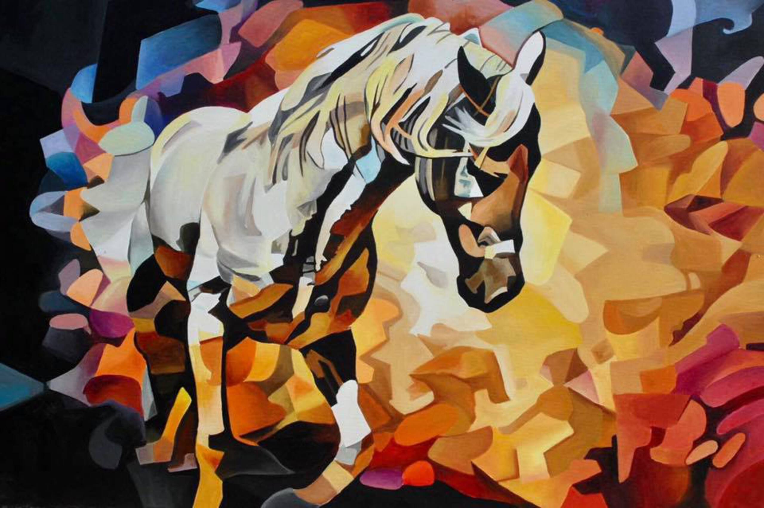 Paard in draf. Wit paard dravend op een zanderige ondergrond in het zonlicht. In dit werk heb ik een explosie van de kracht van het paard willen weergeven. De geometrische geabstraheerde vormen versterken dit gevoel. Het paard lijkt, als het ware, uit een tunnel van licht te komen. Doordat de vormen in het centrum lichter en naar de buitenkant donkerder geschilderd zijn. Het paard komt zo uit een tunnel van licht.