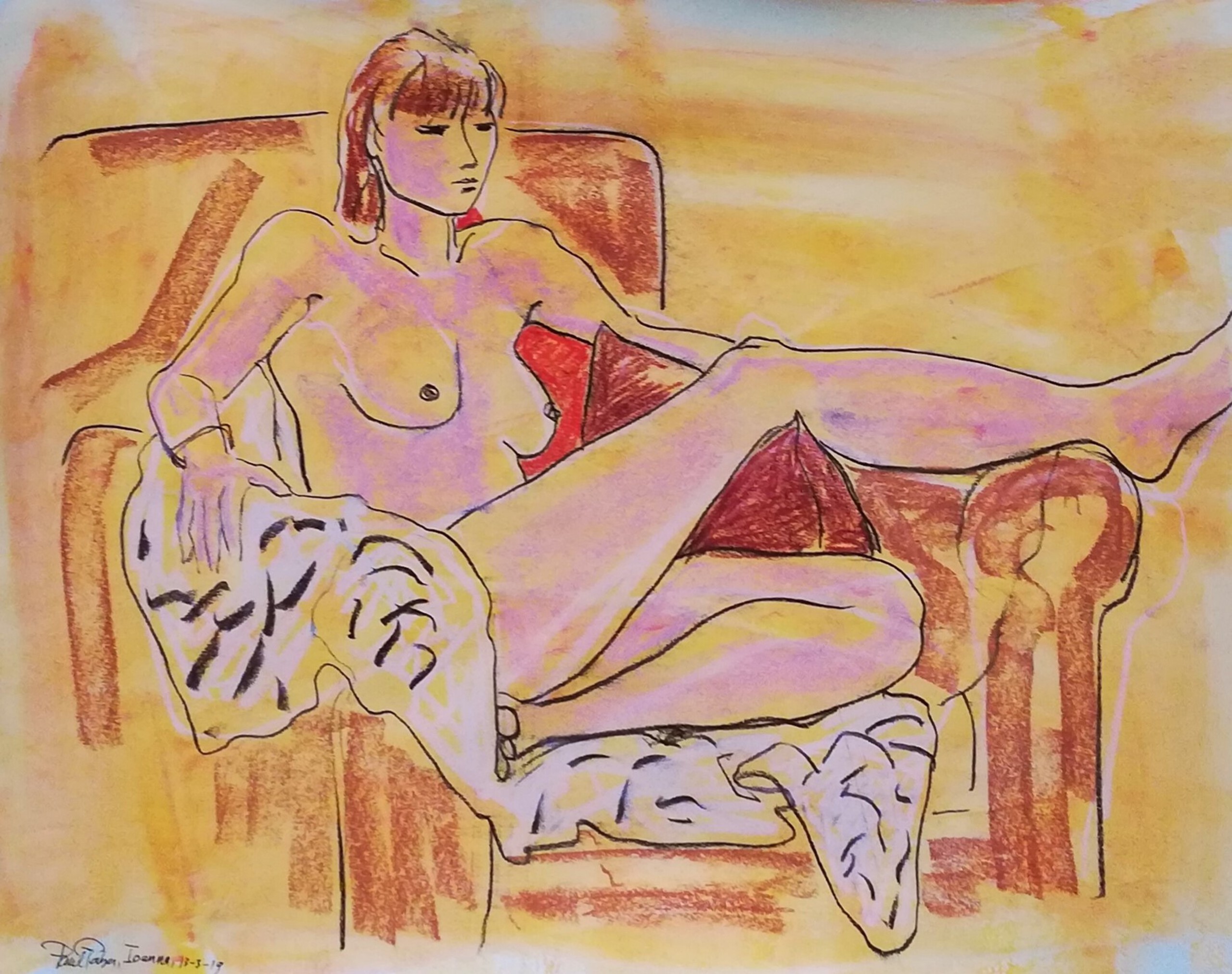 Naakt op stoel in pastel.