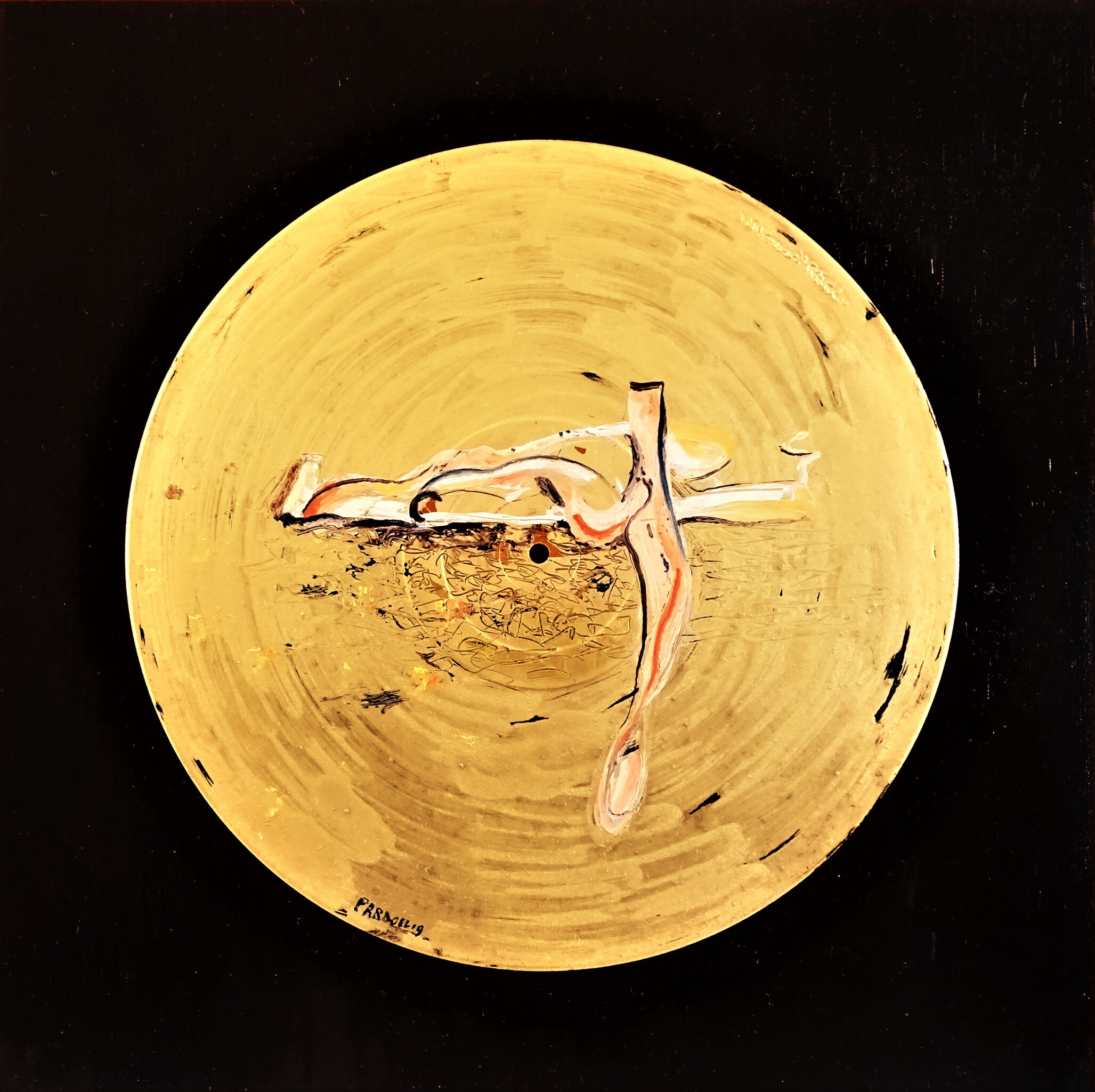 Studie voor nieuwe Heiligen 2. Geschilderd op een lang speelplaat en vastgemaakt op een houte vierkante ondergrond. Goudverf en olieverf