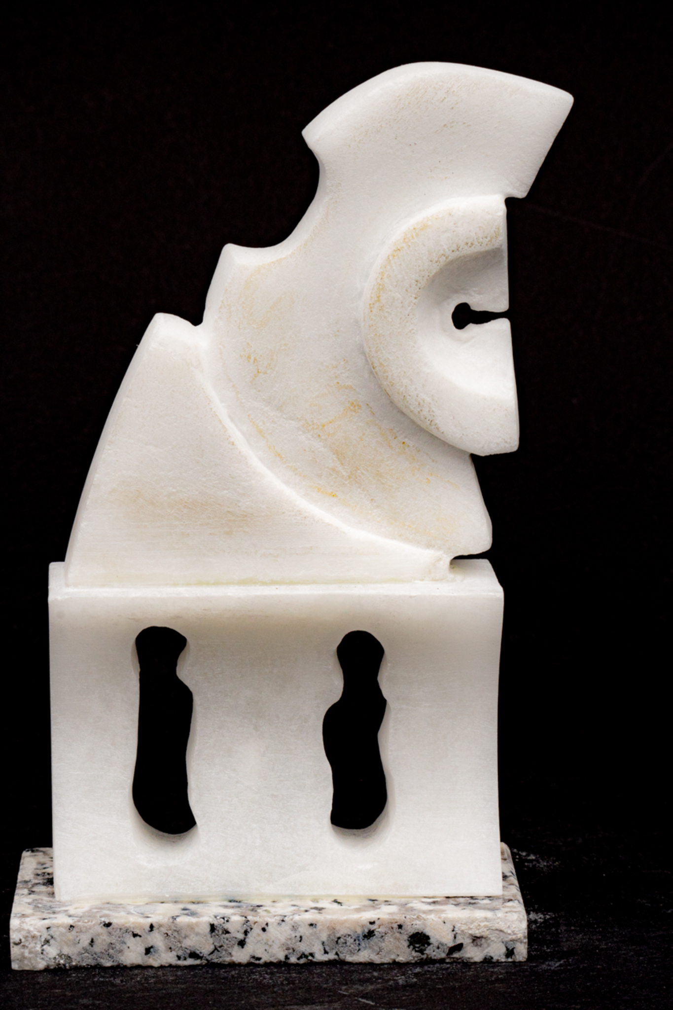 Twee samengevoegde stukjes albast en een voetplaat van graniet vormen een abstracte compositie met de uitstraling van een monument.