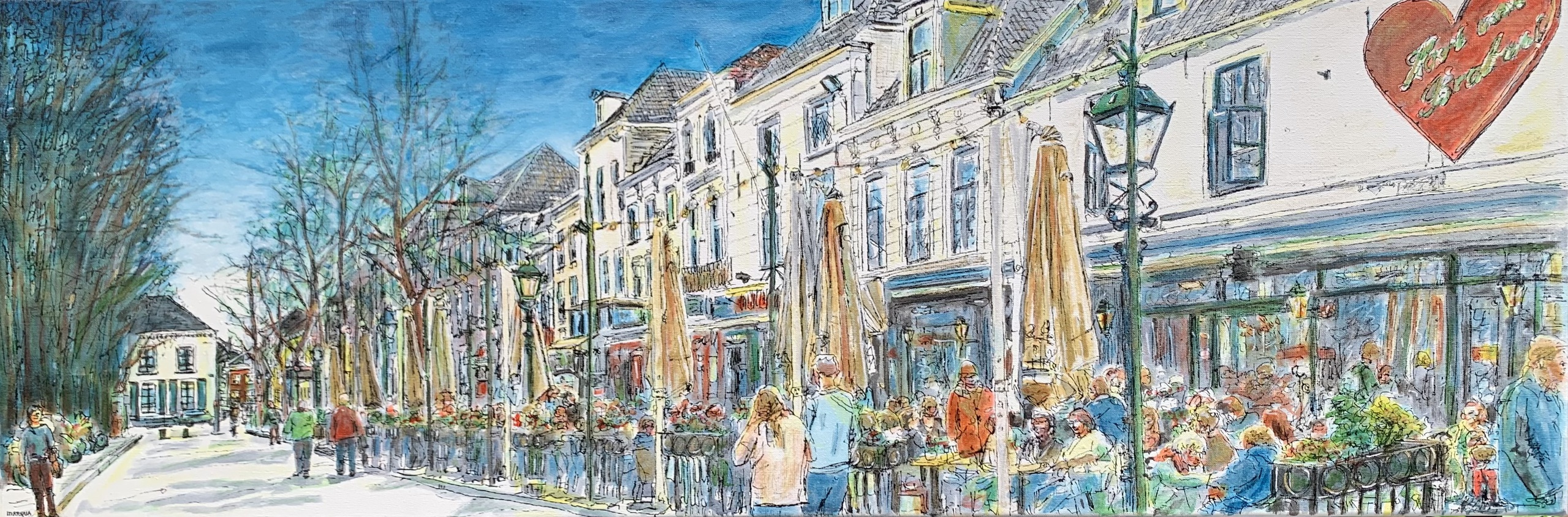 Inktschilderij van de cafés op de Parade, linnen doek 40x120 cm.