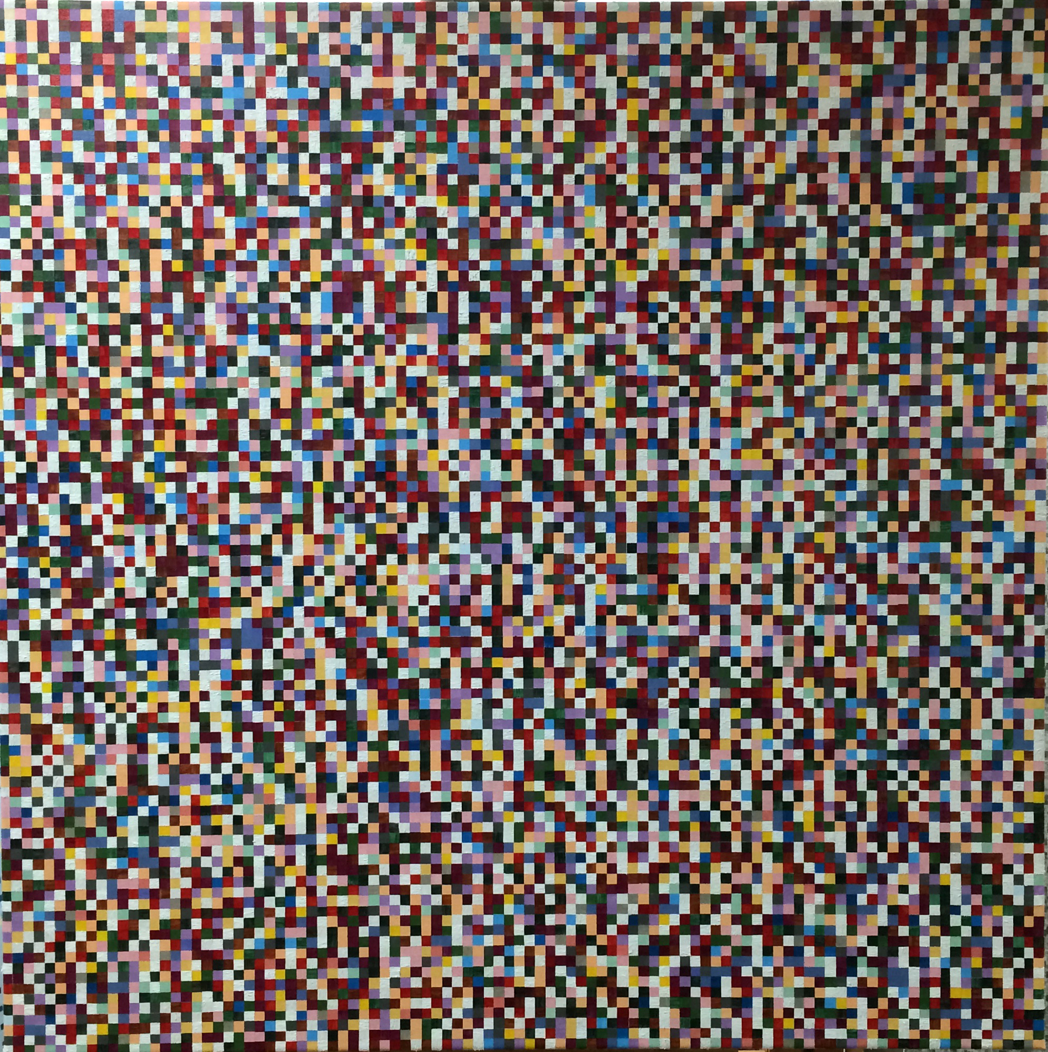 Thema: Chaos (Geometrische Chaos) Mijn kunst is beïnvloedt door de moderne wiskundige en wetenschappelijke benadering van het begrip complexe orde van de natuur. Met name heb ik me verdiept in de Chaos theorie en de fractal geometrie. Ik ben geen wiskundige, en ik gebruik geen wiskundige formules. De ideeën van de Chaos theorie en fractal geometrie leiden tot de ontwikkeling van de composities in mijn werk. Ik gebruik driehoeken,vierkanten en cirkels in mijn schilderijen, maar in mijn huidige serie, geoChao richt ik me alleen op de vierkanten en de verhoudingen tussen de vierkanten. Ik ontwikkel mijn composities door kleine vierkantjes op grote te zetten of grote op kleine te zetten. Het gaat om de onderlinge verhoudingen tussen de vierkanten. Ik laat de methode die ik kies de compositi