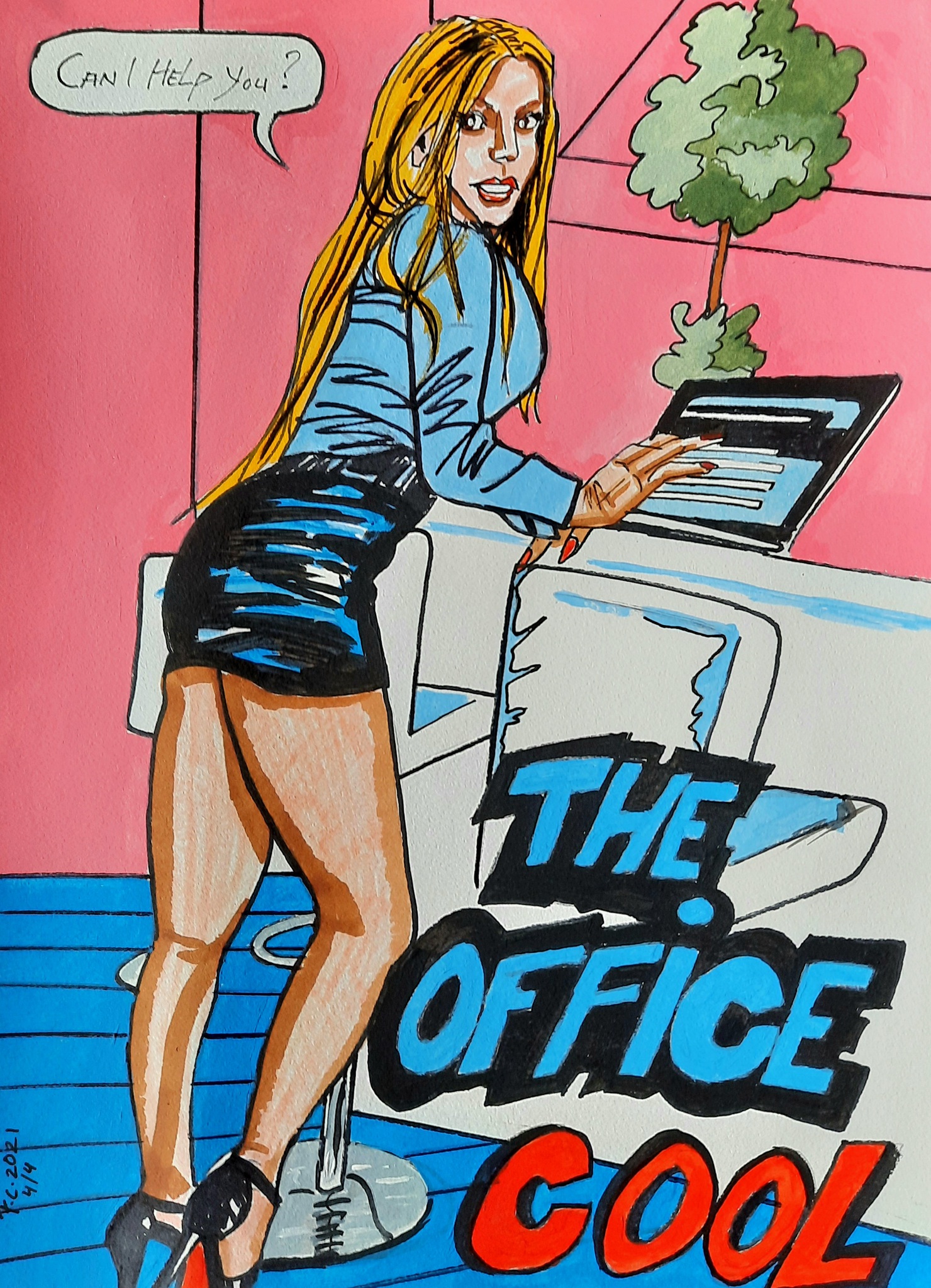 Vrouw Art Blue Jonge Pink Kantoor Popart Office Secretaresse Sexy Erotiek
