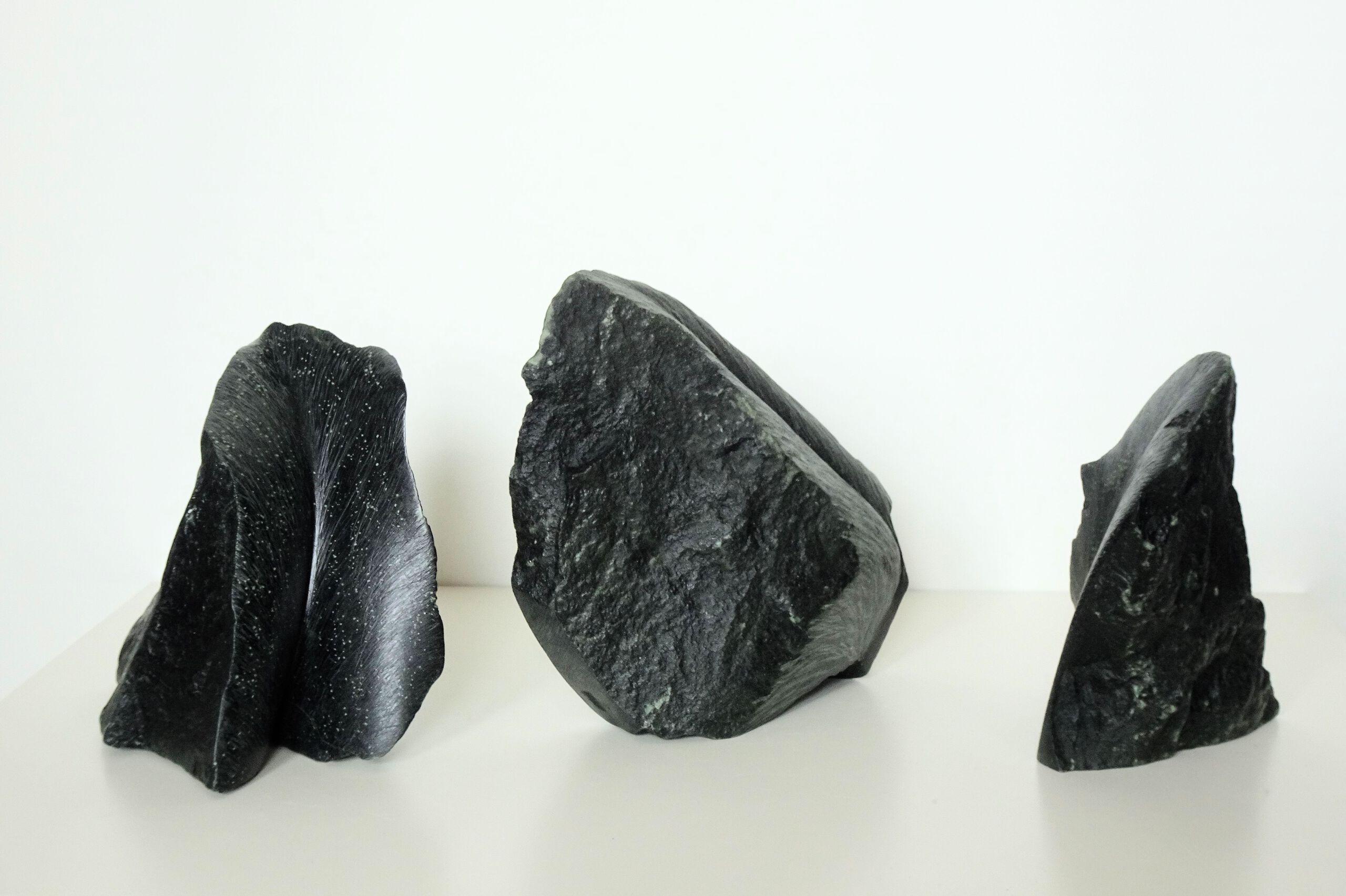 3 bij elkaar horende 'wilde stenen' materiaal: zwartgroene Springstone uit India. De genoemde afmetingen geven de grootste maten van de individuele stenen aan [dus niet het totaal!] Prijzen inclusief event. verzendkosten