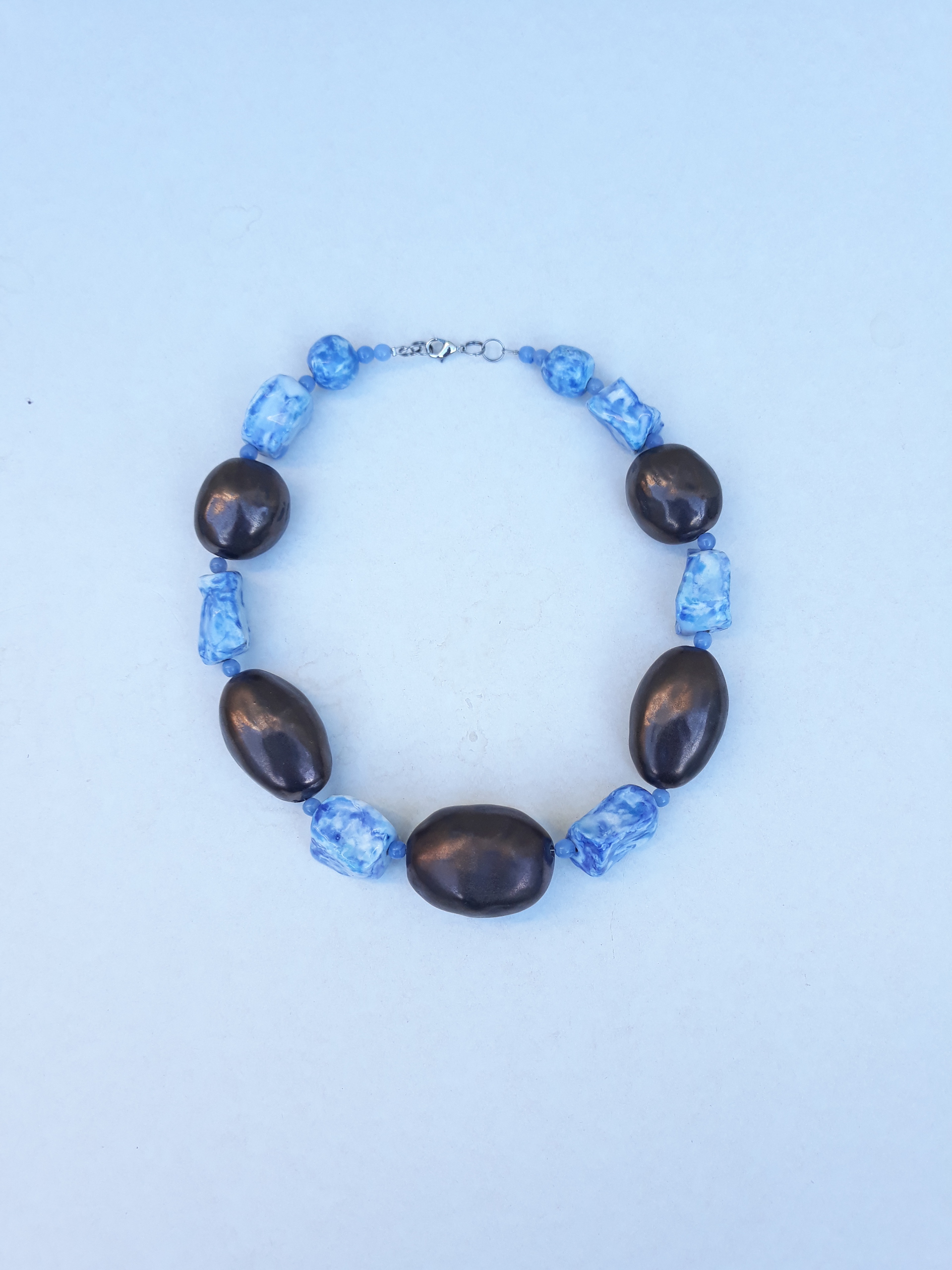Ketting met grote goud-bruine kralen van porselein, gecombineerd met blauw-wit geglazuurde kralen, eveneens van porselein.