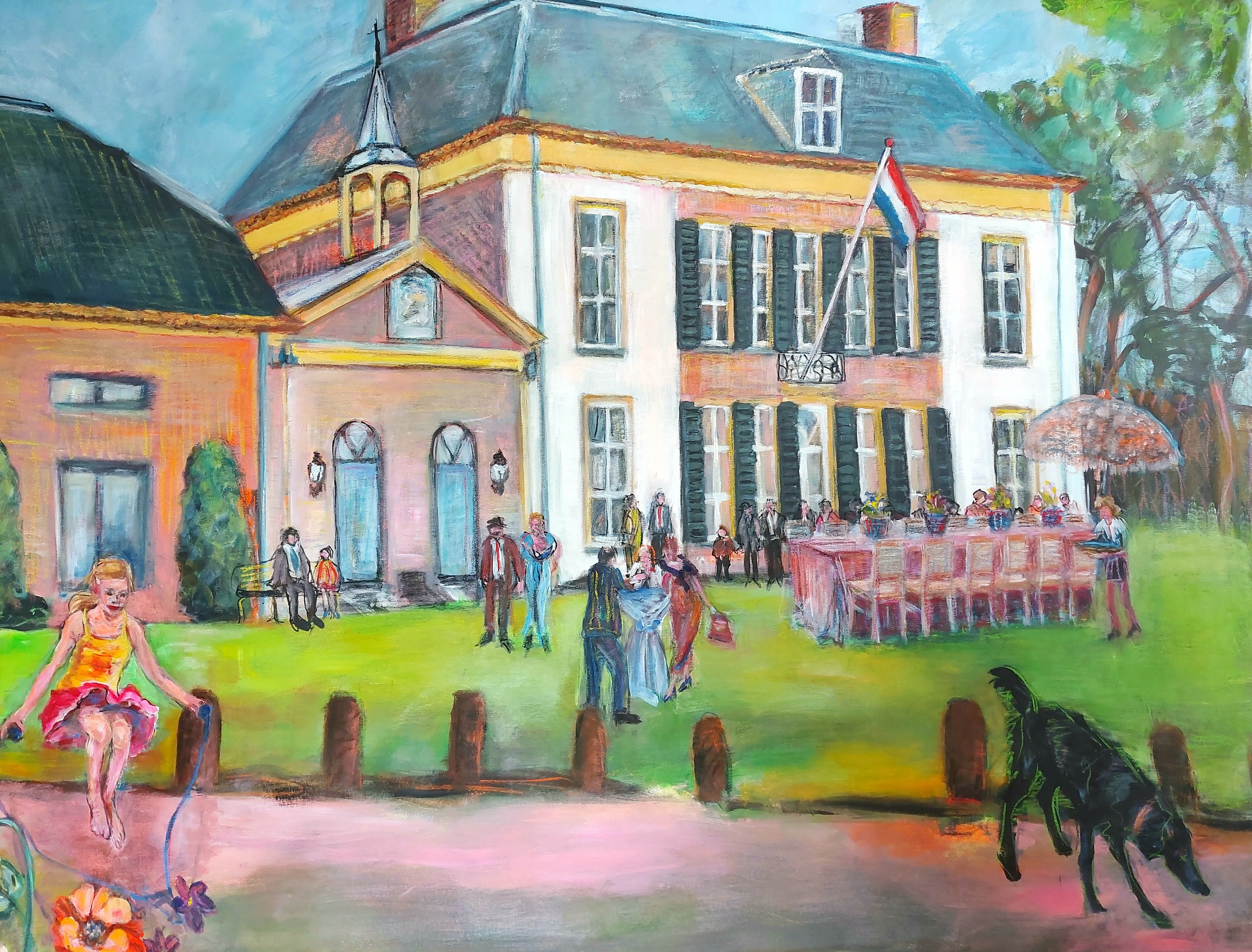 Huis Schilderij Zon Feest Kleurrijk Tuin Bos Restaurant Buiten Tafel Evenement Dineren Bruiloft Kunstkaart Dorpshuis Brakel Huisbrakel