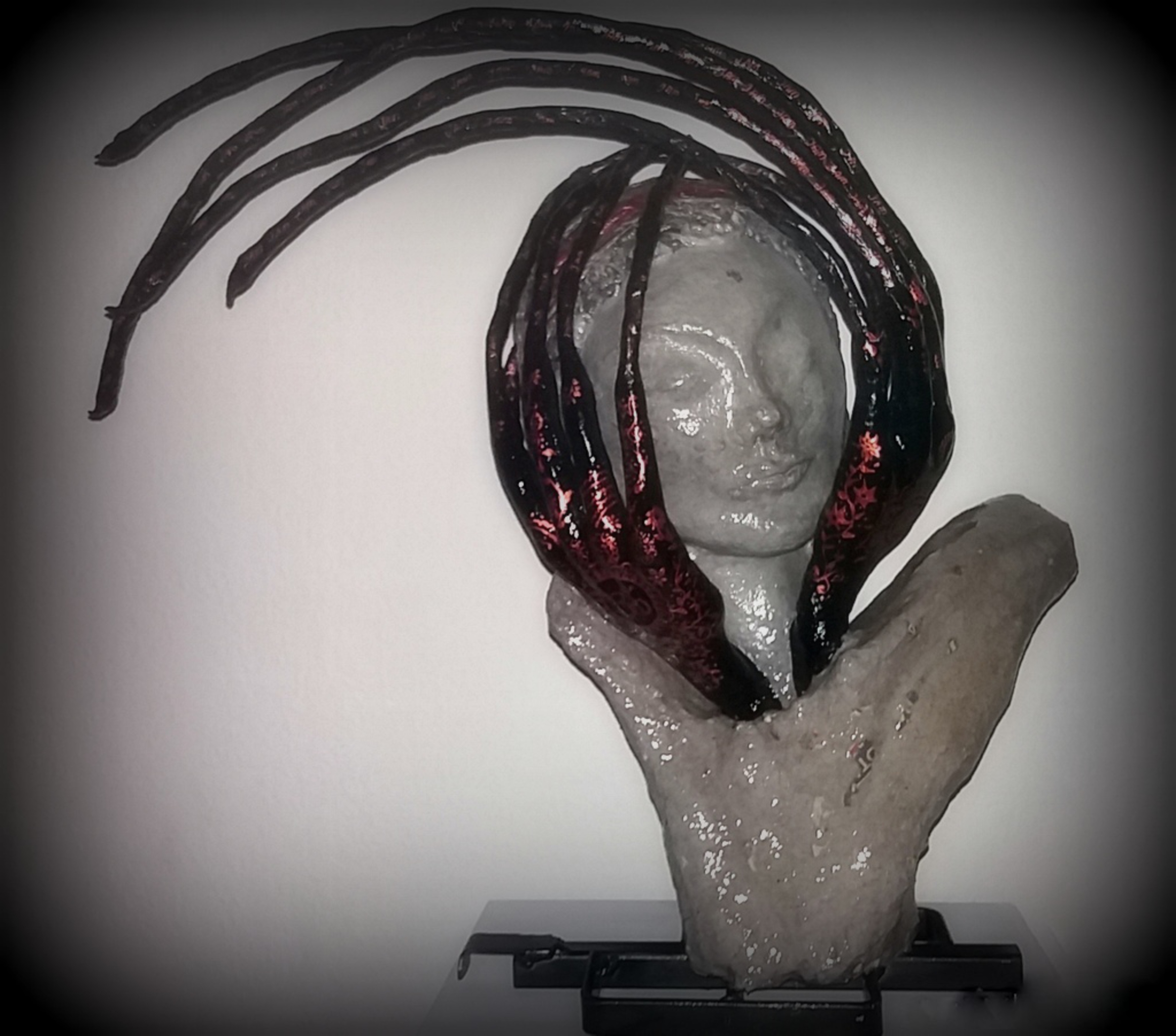 Deze sculptuur toont een vrouwenhoofd dat rust in haar eigen handen — een moment van terugkeer naar zichzelf. Gemaakt van solide papier-maché en papierpulp, straalt het werk zowel kwetsbaarheid als innerlijke kracht uit. De vingers strekken zich uit in de ruimte en nemen, letterlijk én figuurlijk, hun eigen plek in. Op haar handen draagt ze mehndi’s: symbolen van bescherming, schoonheid en identiteit. Langs de verlengde vingers staat als een zachte, herhalende mantra geschreven: ‘I am’. Een herinnering aan aanwezigheid, bestaansrecht en innerlijke sereniteit. Meer informatie in mijn blog: https://lilianesart.jimdoweb.com/i-am-serenity-sculpture/