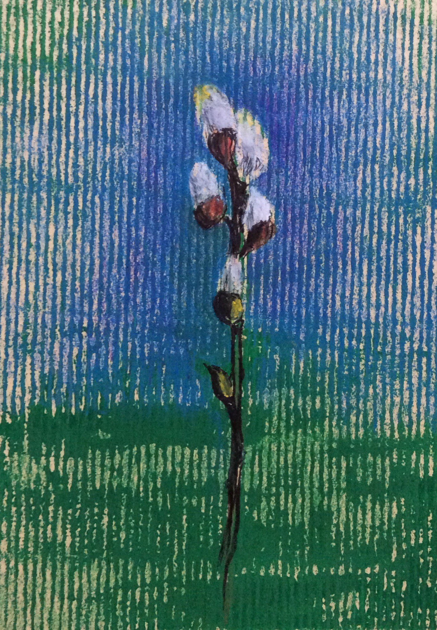 Katjes op ondergrond van blockprint, kleurpotlood en inkt