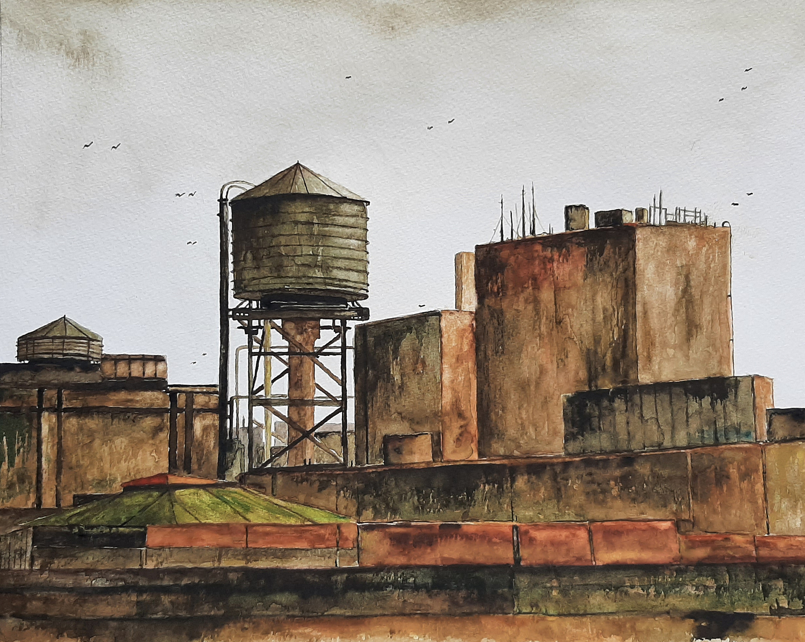 Een van mijn voorkeuren die ik kies bij het aquarelleren: de watertoren. In Nederland zijn dat vaak nogal obligatie utilitaire gebouwen. In de USA, en met name in de grote steden, zijn die 'watertowers' kenmerkende installaties/gebouwen in de verstedelijkte omgeving. New York, Chicago, Detroit enz, er staan er honderden, boven op hoge gebouwen. Vooral tegen de avond krijgen ze bijna een functie als 'landmark', zoals ze tegen de lucht staan afgetekend. Zoals deze in indrustriestad Detroit. Een stad in verval vanwege achterstallig onderhoud in de auto-industrie. Het aquarel is gemaakt op 300grams Canson-Montval papier De vermelde prijs is exclusief passe-partout en/of lijst