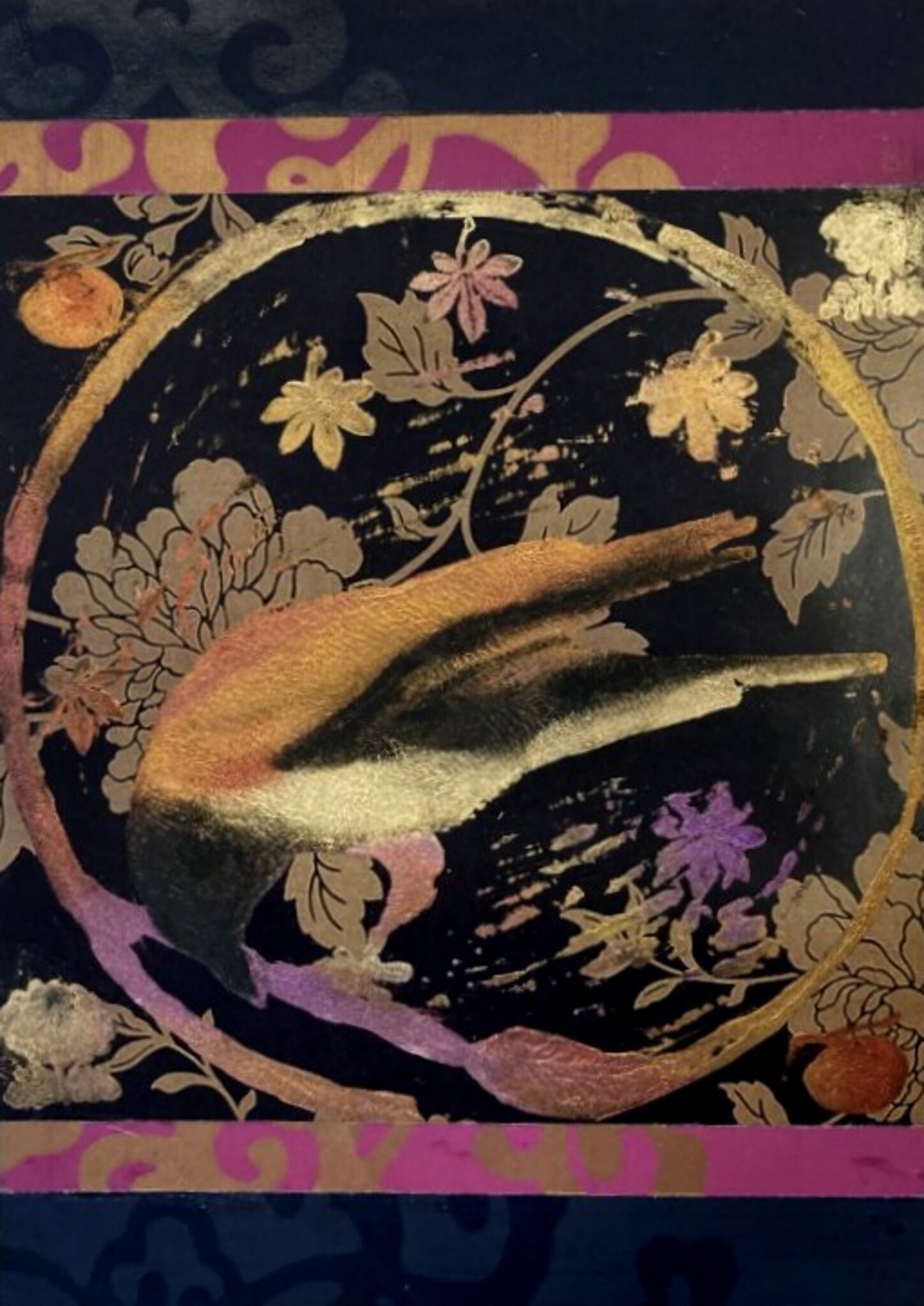 Linoleumdruk van een kraai, die met een penseel een cirkel om zich heen trekt en Japanse stempels op decoratieve ondergrond. Bewerkt met metallic poeders, diverse lagen luxe papier. In houten wissellijst met passe-partout 30 x 40 cm