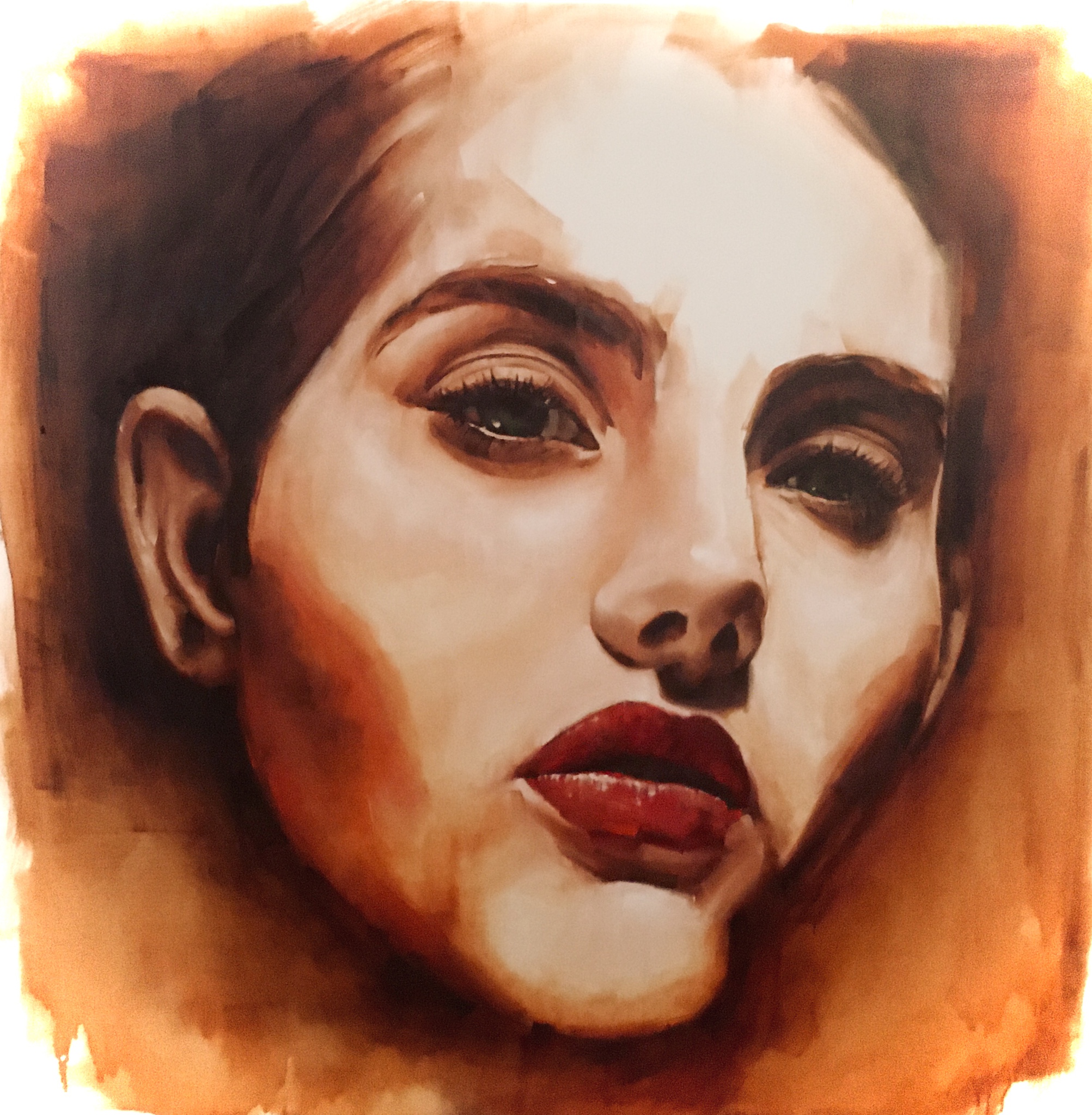 Vrouwengezicht uitvergroot, olieverf op linnen