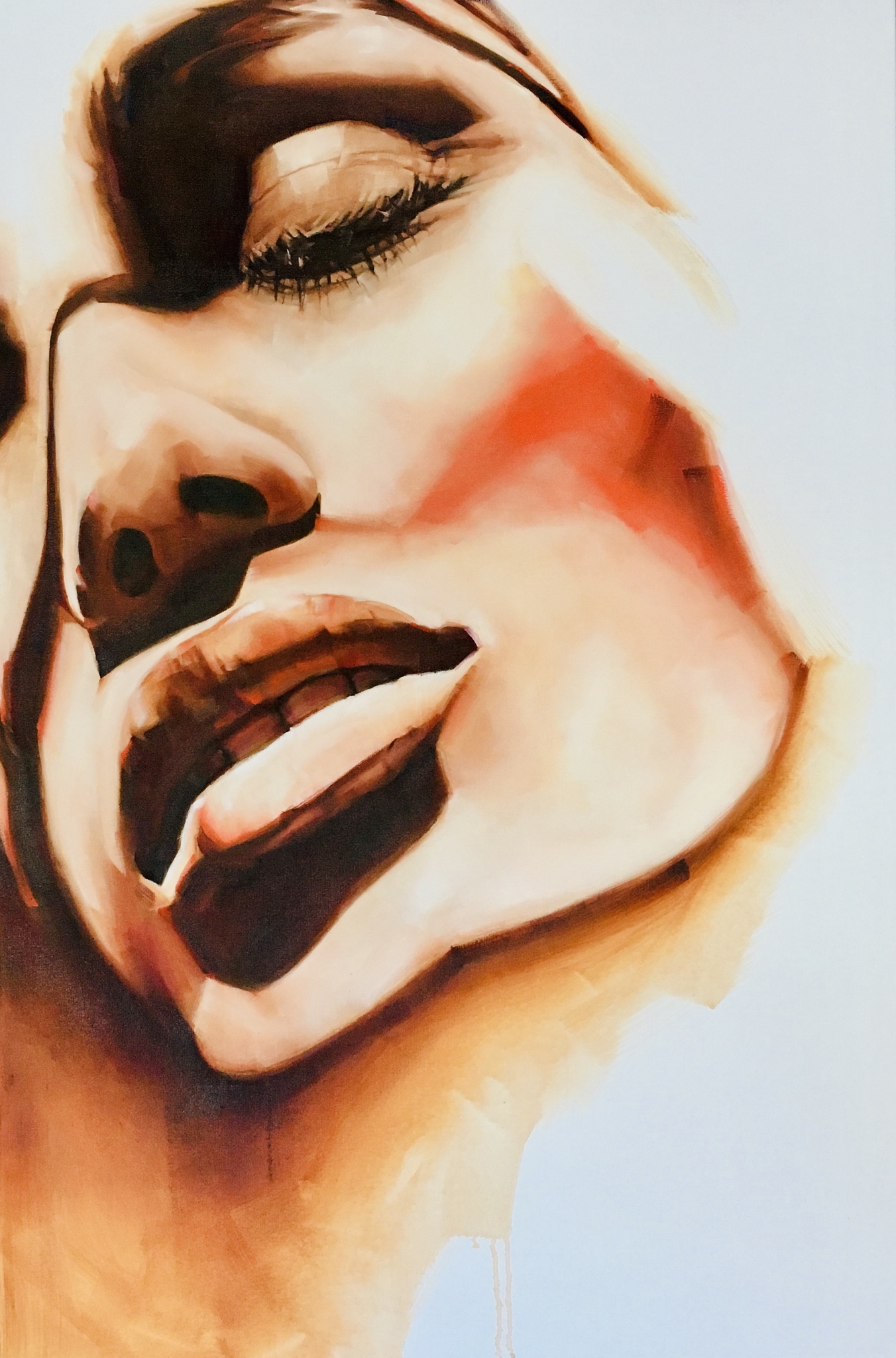 Vrouwengezicht uitvergroot, zonlicht, olieverf op linnen