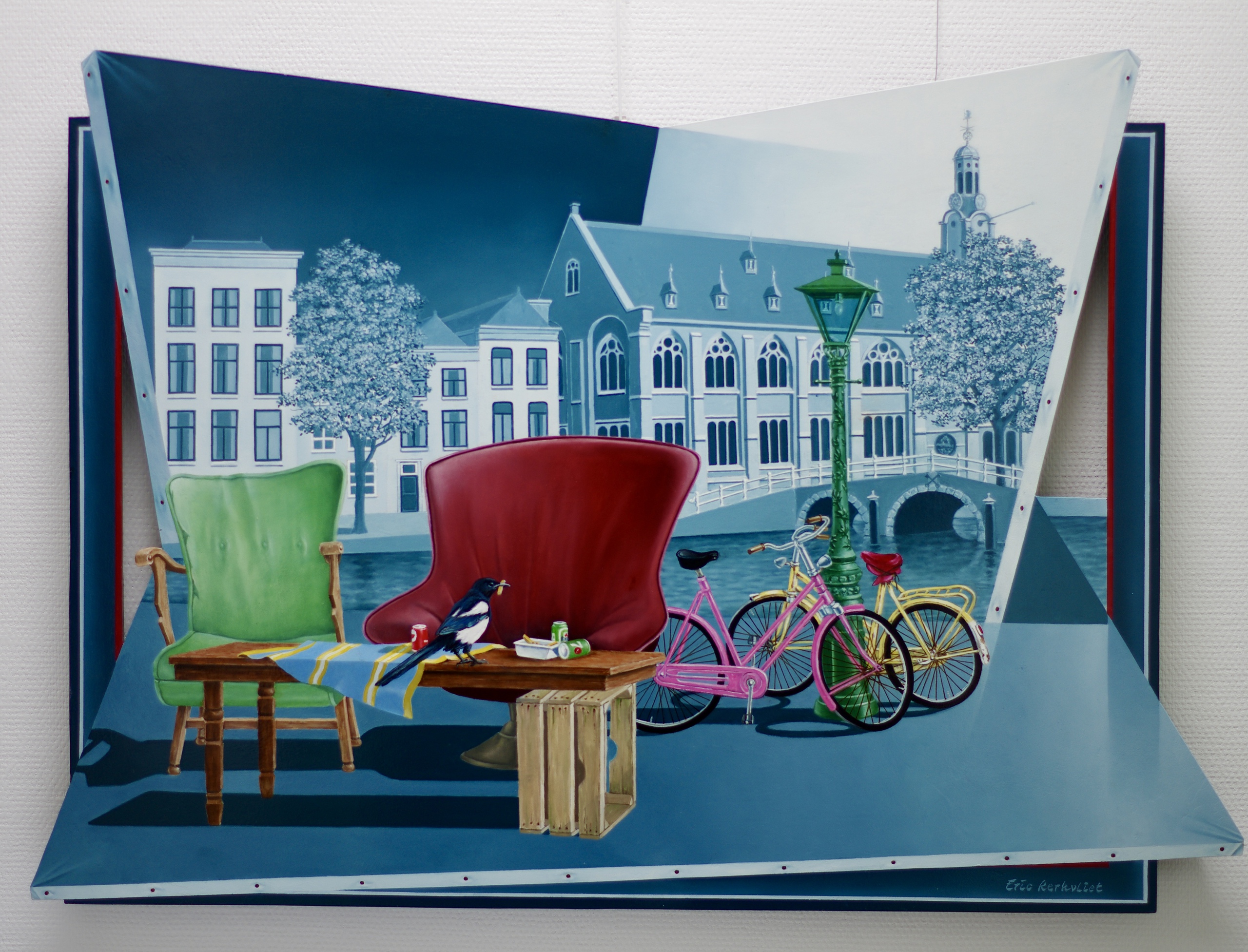 Eric Kerkvliet schildert met olieverf uiterst gedetailleerd voorstellingen op iets verhoogd paneel waardoor bij juiste belichting een Trompe-l’oeil-achtig effect ontstaat.
