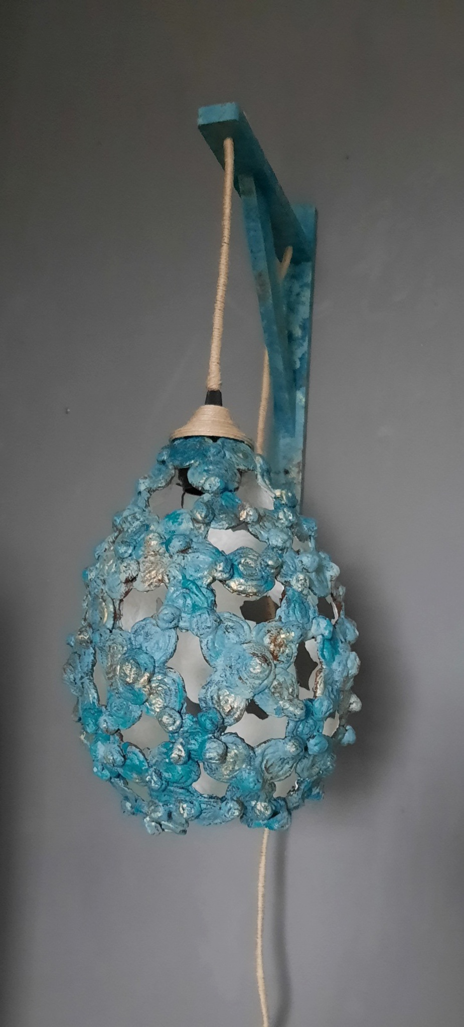 Gemaakt van papier-maché en beschilderd in faux bronze en groene patina. De wandhouder is de zelfde stijl beschilderd. Snoer en fittingkap met sisal. Fitting en snoer zijn CE goedgekeurd. Het zijn ca. afmetingen.