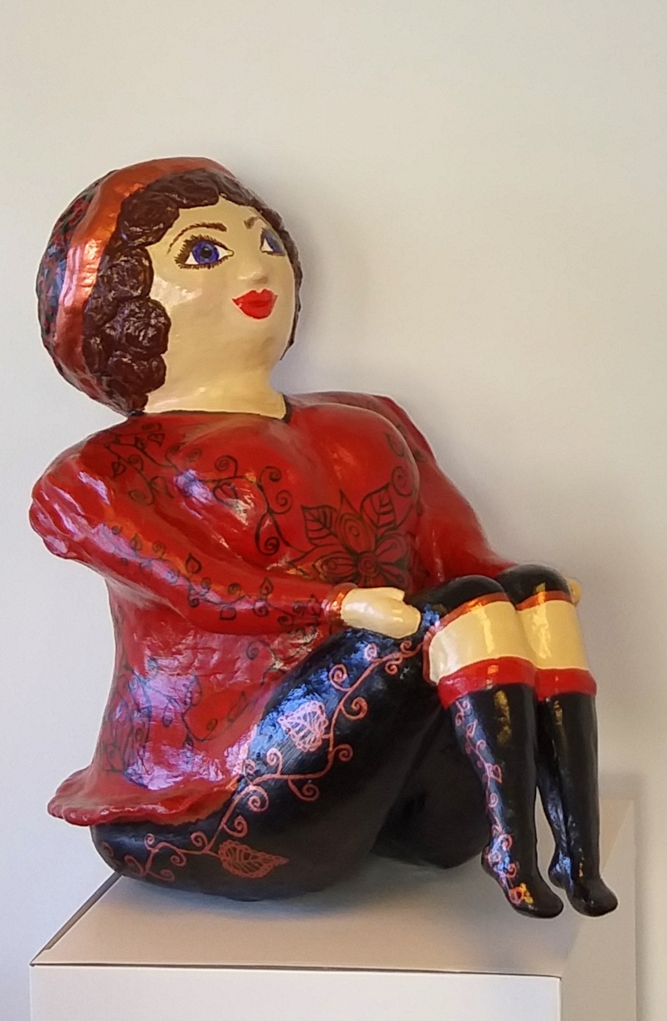 Vrouwen, mythologie, kleur en symboliek vormen de kern van haar solide sculpturen, happy angels en lampen, gemaakt in expressieve papier‑maché vormen.