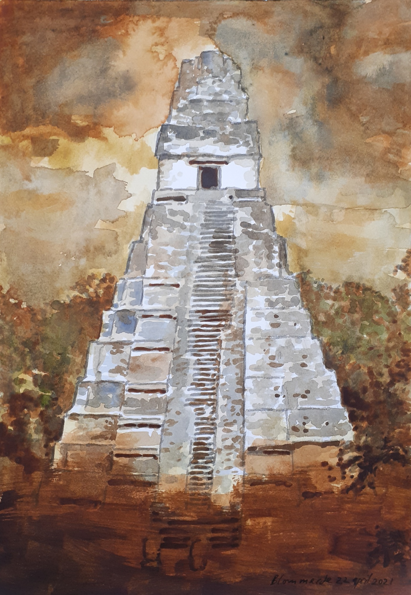 Figuratief Aquarel Realistisch Architectuur Piramide Maya Tikal