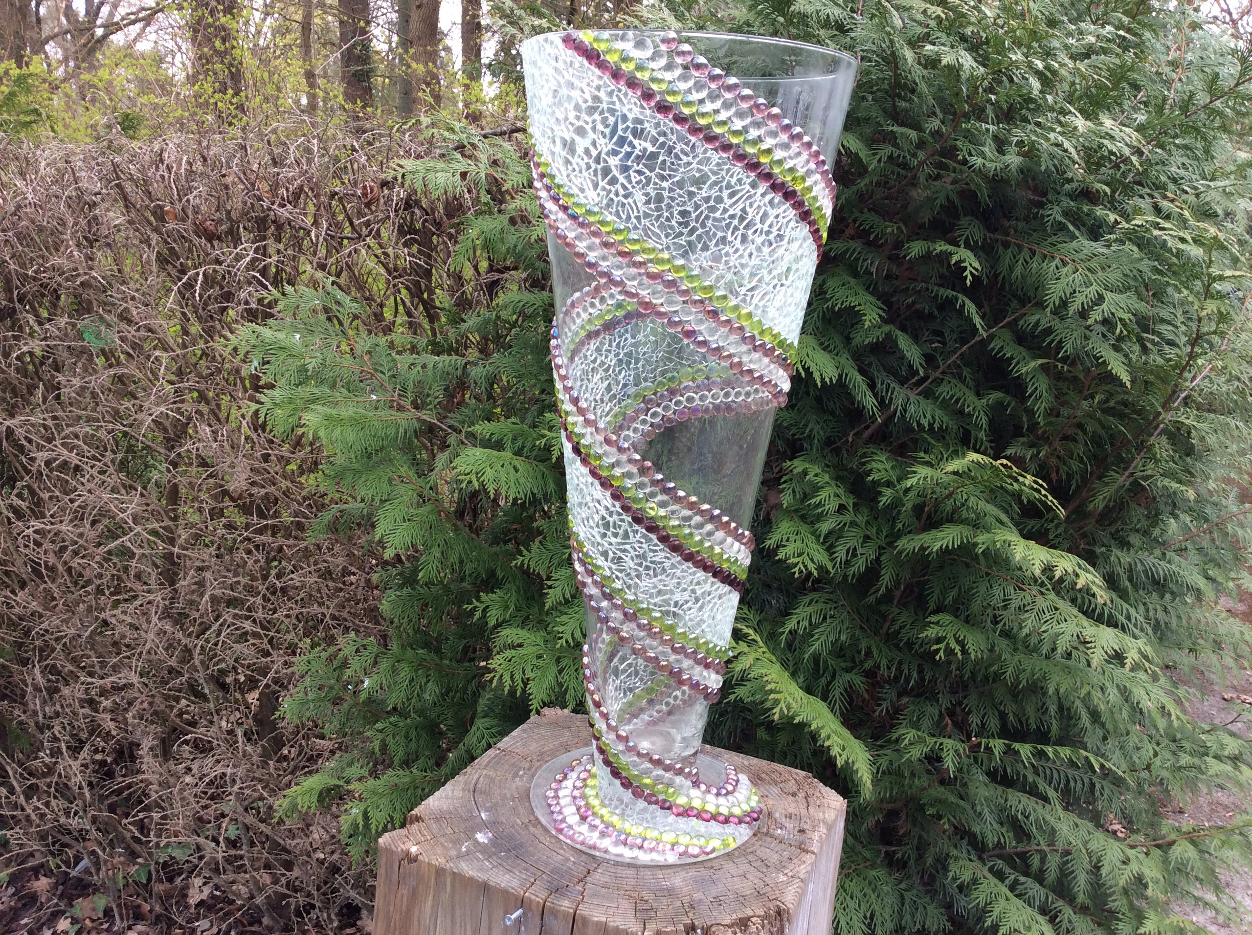 Glazen vaas bewerkt met glazen nuggets in spiraalvorm.