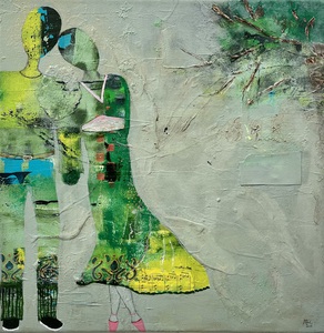 Vergeleken met mijn vorige schilderijen is dit werk leeg en rustig. Het is vloeiend en nodigt uit tot aanraken. Door een ander palet voelt het warm en het geeft de ruimte om je gedachten te laten dwalen.