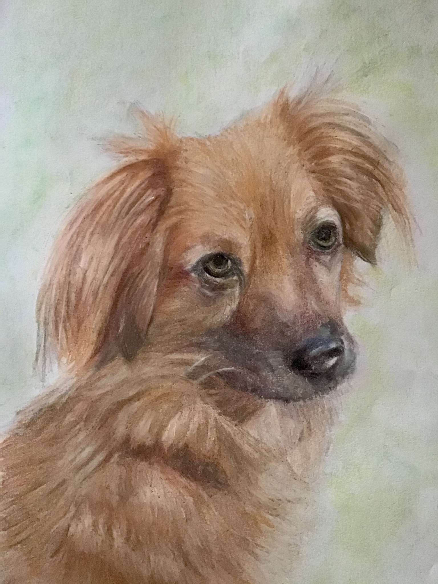 Ons leuke buurhondje. Pastelpotlood en -krijt.