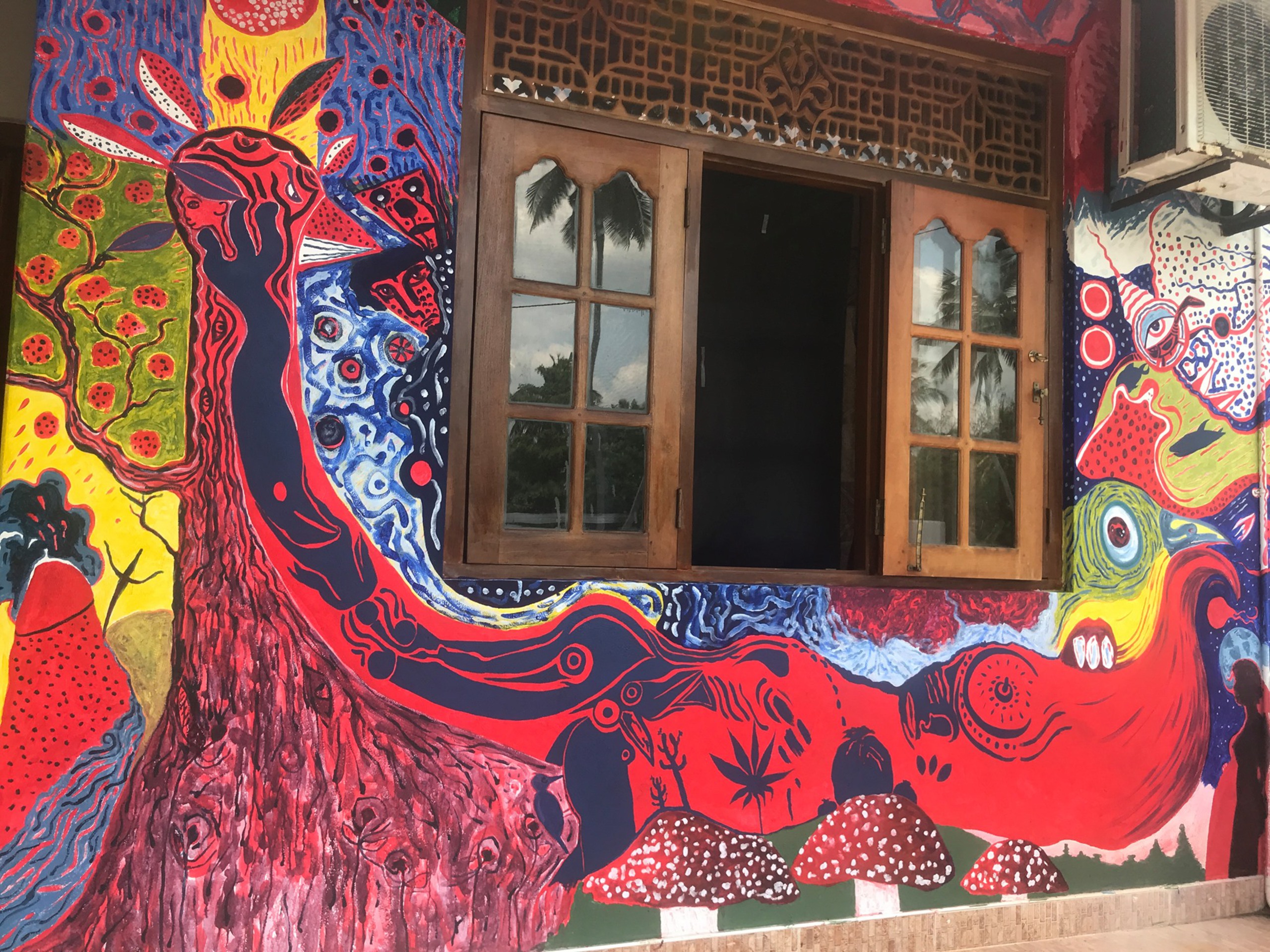 Een muurschilderij dat ik spontaan geschapen heb, zo spontaan mogelijk als god de wereld schiep. In kleur! Hier op de muur van mijn slaapkamer die uitgeeft op het Hamilton Kanaal (Dutch Canal) in Negombo, Sri Lanka.