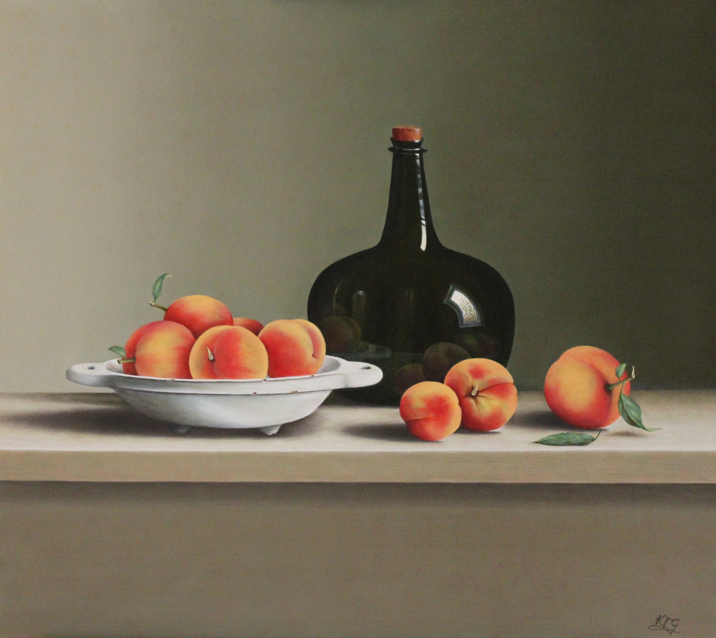 Perzikken op keramiek schaal en groene stolpfles. uitvoering Olieverf op Paneel