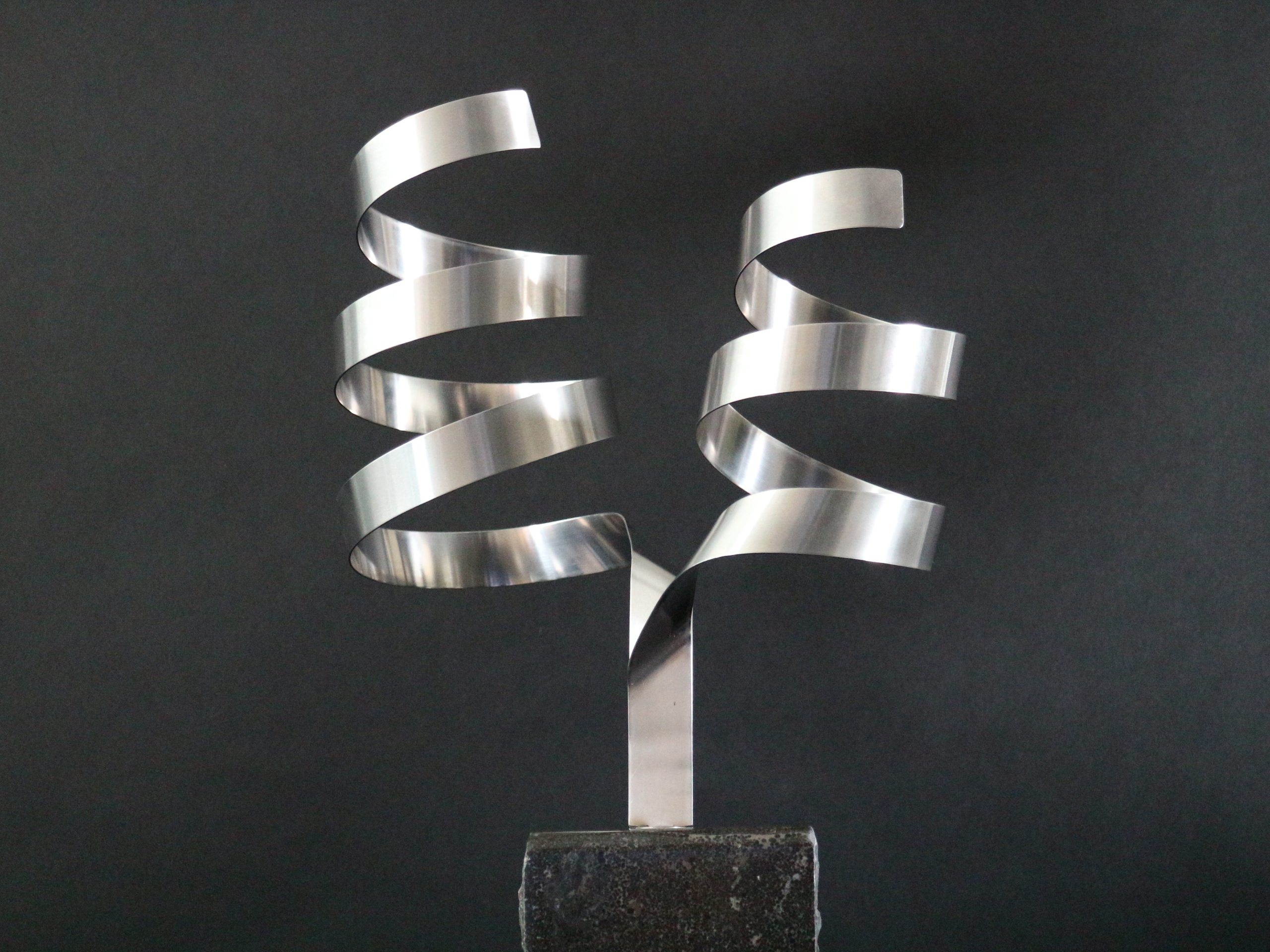Voor de zomerexpositie van Gallery Sille met als thema "Draai" is dit werk speciaal gemaakt. Het symboliseert voortschreidend inzicht waarbij je ook wel eens een draai moet maken. Daardoor kom je uiteindelijk op een hoger plan. Het sculptuur is gemaakt van 3 cm breed en 1 mm dik RVS strip. Gemonteerd op een hardstenen sokkel.