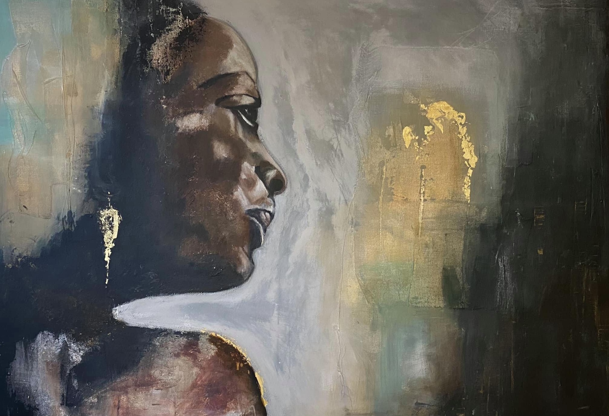 Portret op doek in acrylverf met lichte structuur (zand, krijtpoeder, koffie, stof, etc) en bladgoud. Incl. Lijst