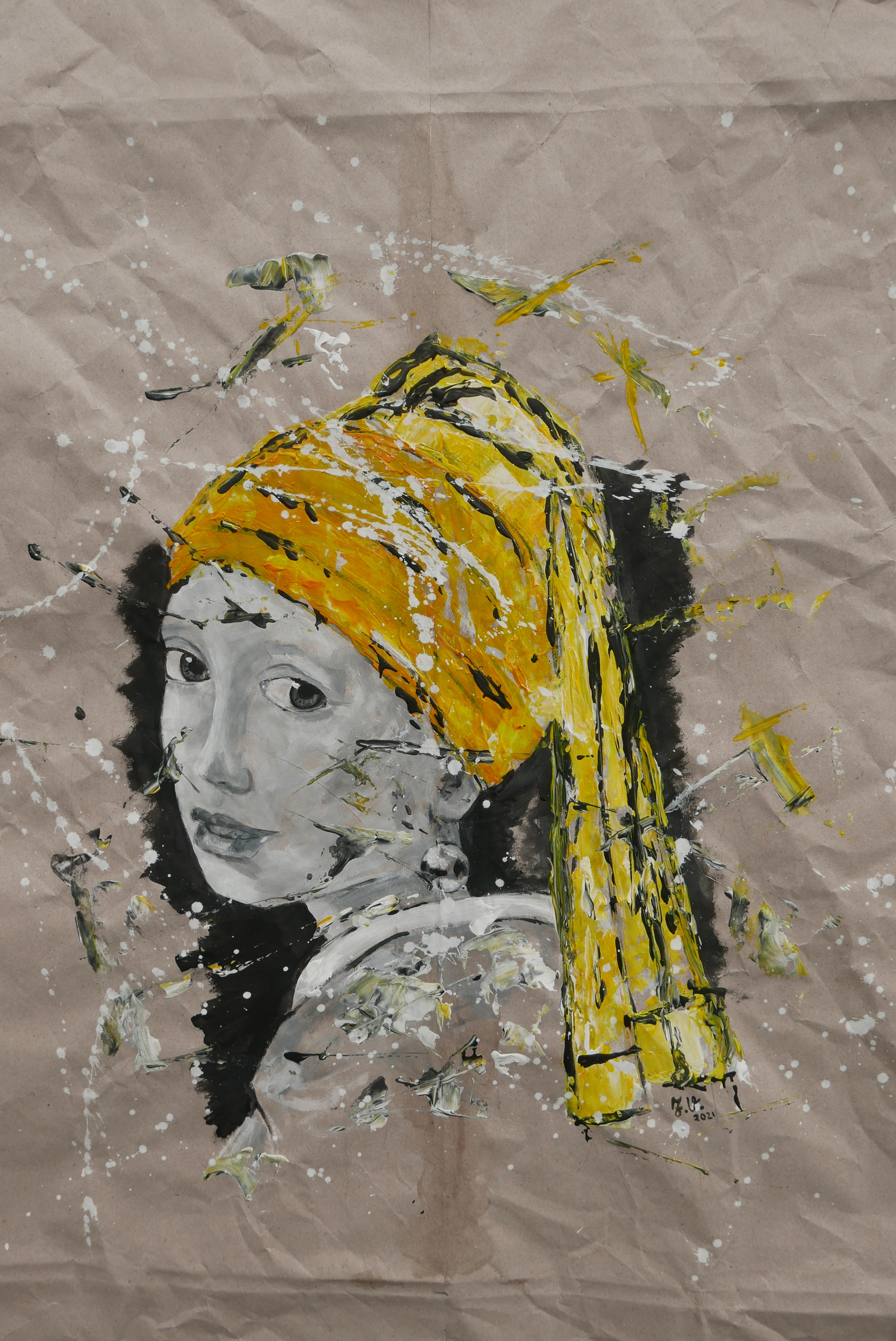 Een beetje van J. Vermeer een een beetje van J. Verduin. Meisje met de Parel op oud papier (recycling) in zwart wit met 1 accentkleur geel. Moderne hedendaagse urban/streetart atijl.