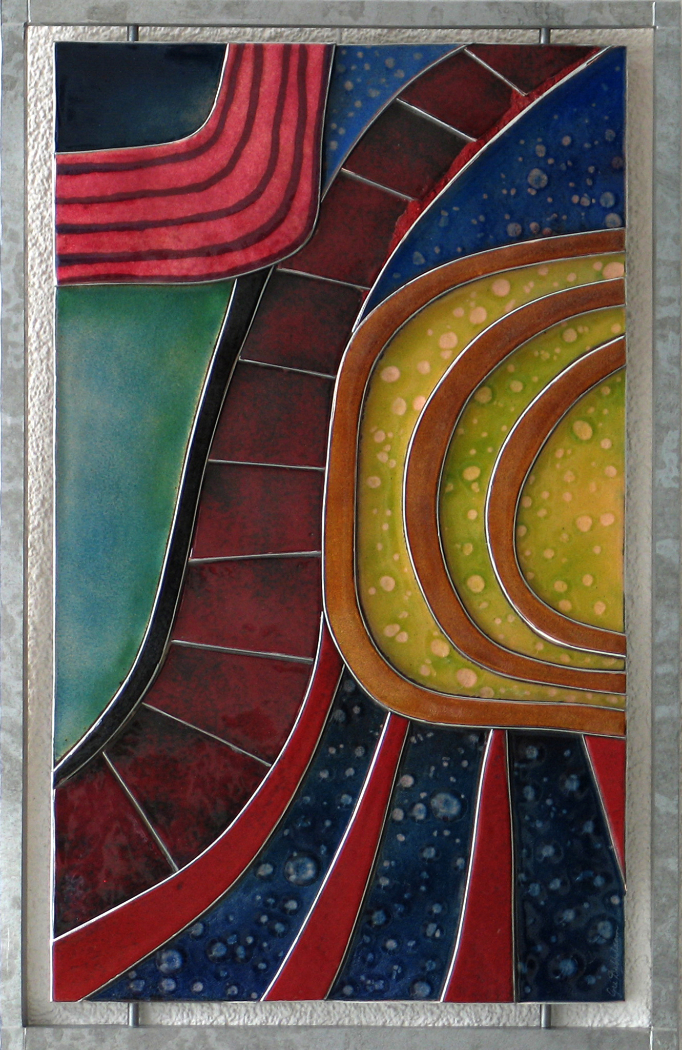Ik ben emailleur en maak wandpanelen en reliëfs. Vaak verwerk ik er ook gefused- of brokken glas in. De zijkanten en holtes van de reliëfs werk ik af met verouderd zink.