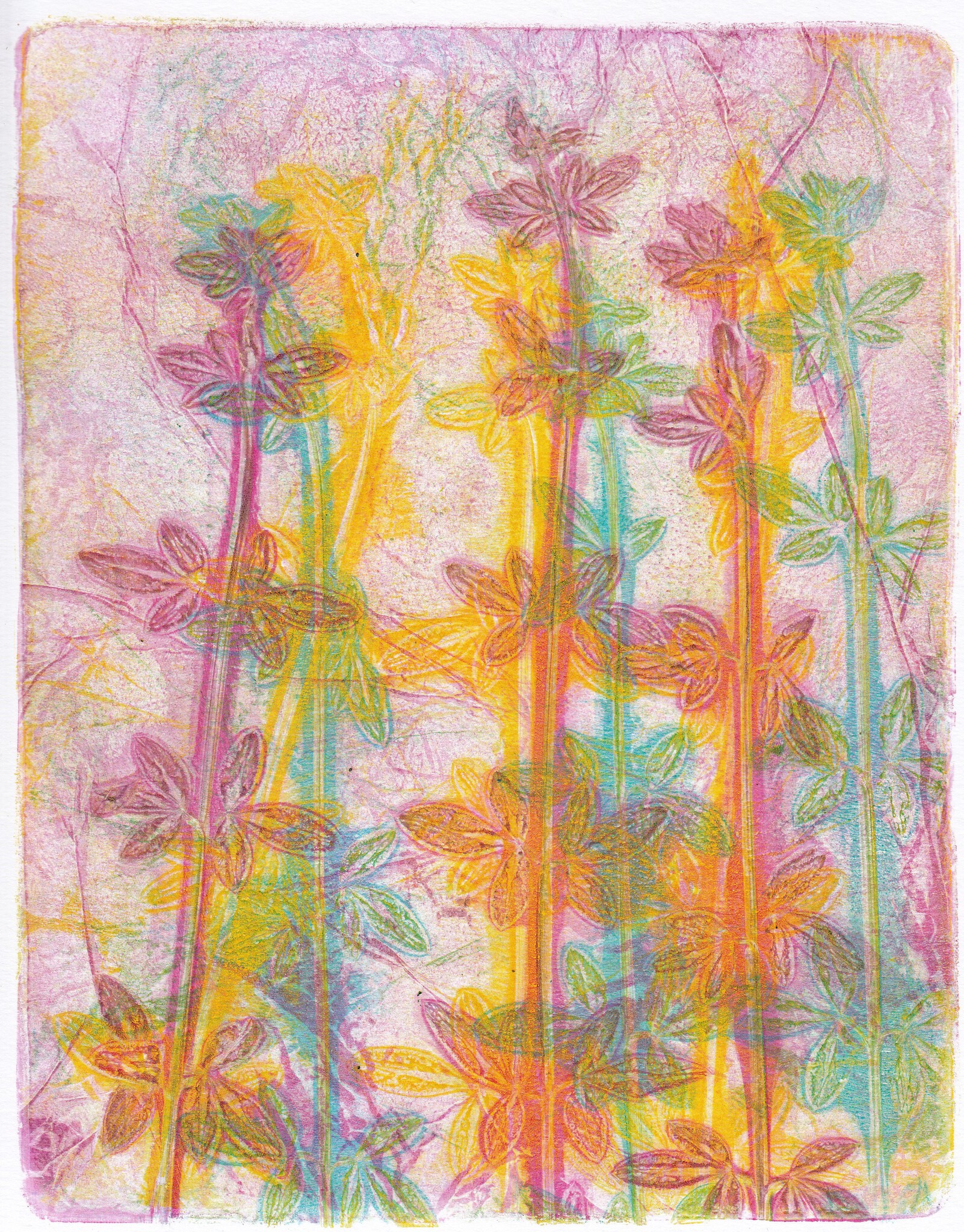 Monoprint gemaakt met driekleur: mangaanblauw, magenta en Indisch geel. De afdruk is gemaakt met een gelplaat, plantmateriaal en acrylverf. Met driekleurendruk gemaakt, elke laag één kleur. Het eindresultaat geeft de drie kleuren, maar ook - daar waar de kleuren overlappen - mooie tussenkleuren. Werk heeft formaat 20 bij 25 cm. Ingelijst in passepartout 30 bij 40 cm.