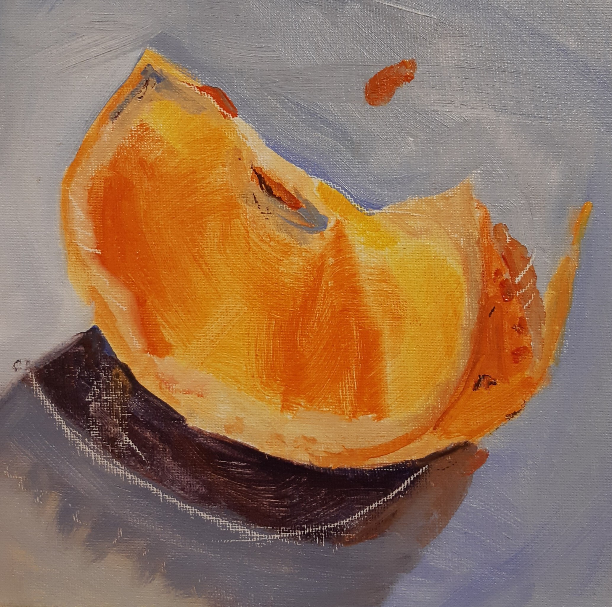 Studie van partje van citrusvrucht. Alla prima geschilderd op canvas board. Gemaakt in Knockart studio tijdens schildersessies rond groente en fruit. Na een serie bijeenkomsten waar we werkten in klassieke gelaagde werkwijze, gingen we over op snel schilderen, alla prima. We maakten allemaal onze eigen opstelling en compositie. Ieder had zo een eigen aanpak. Verkocht.