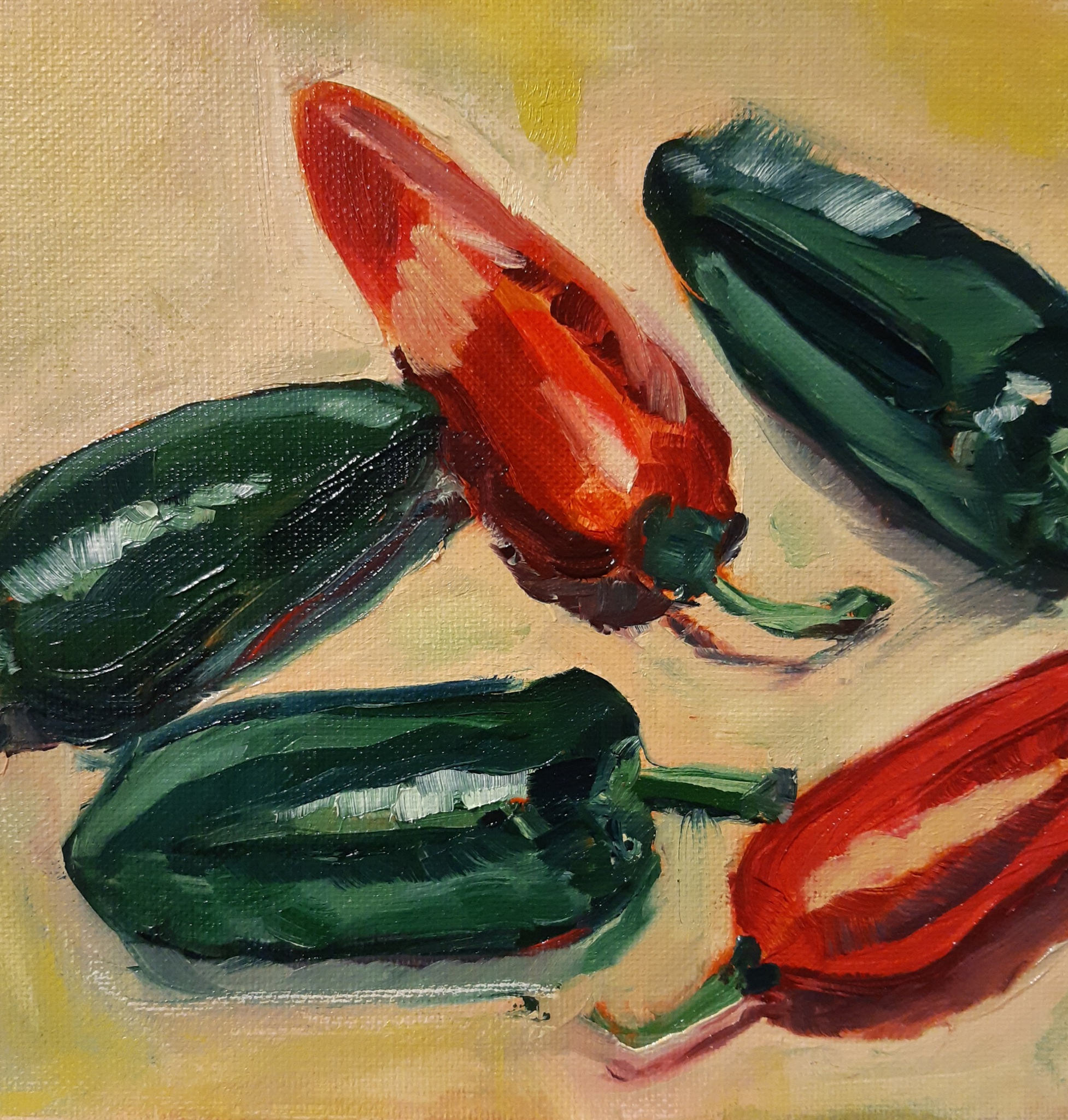 Studie van pepers. Alla prima geschilderd. Voor mij zitten er meerdere lagen van betekenis in zo'n klein schilderijtje. Pepers zijn een regelmatig terugkerend element in onze keuken. Kijk ernaar en je ziet de smaak al bijna. Ik vind het heerlijk onderwerp om te schilderen vanwege de prachtige kleuren en de reflectie van het licht. Een spel met vormen en compositie.