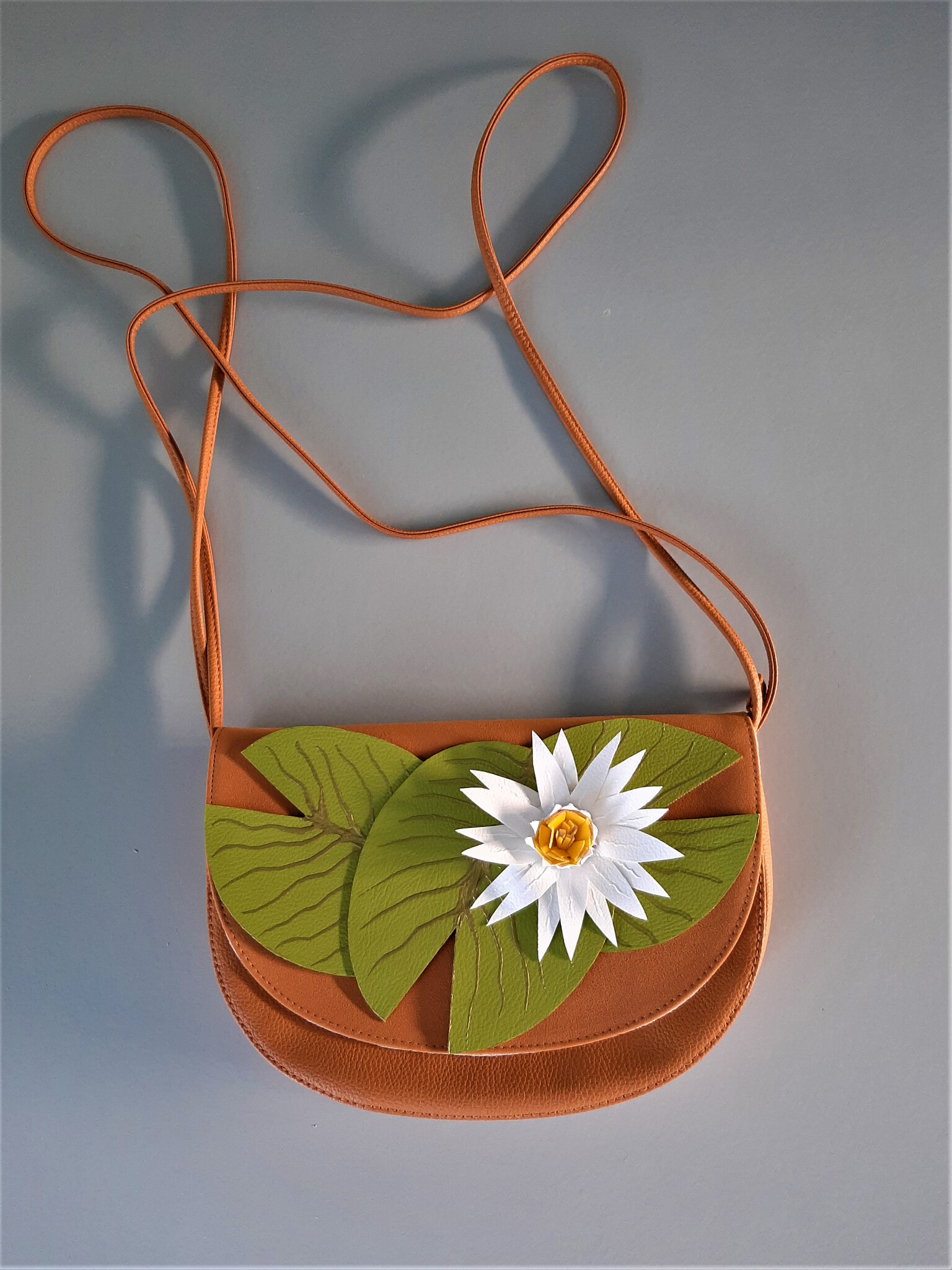 Waterlelie tas, voorfront is op te klikken met magneten, kan je dus wisselen.Bestaande tas van kunstleer, voorfront ook van kunstleer.
