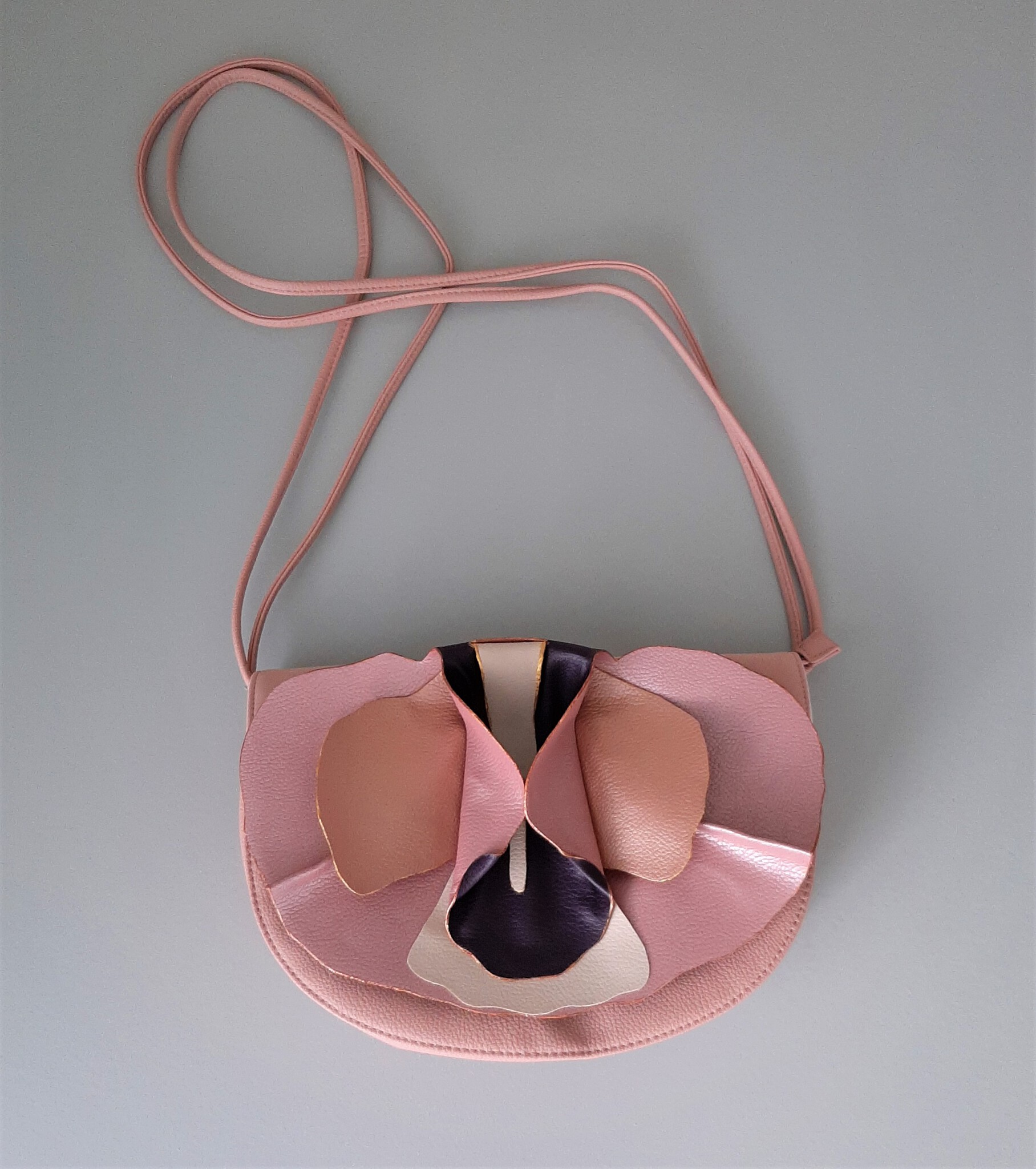 Orchidee tas, voorfront is erop te klikken met magneten. Je kan dus wisselen. Bestaande tas is van kunstleer en het voorfront is ook van kunstleer.