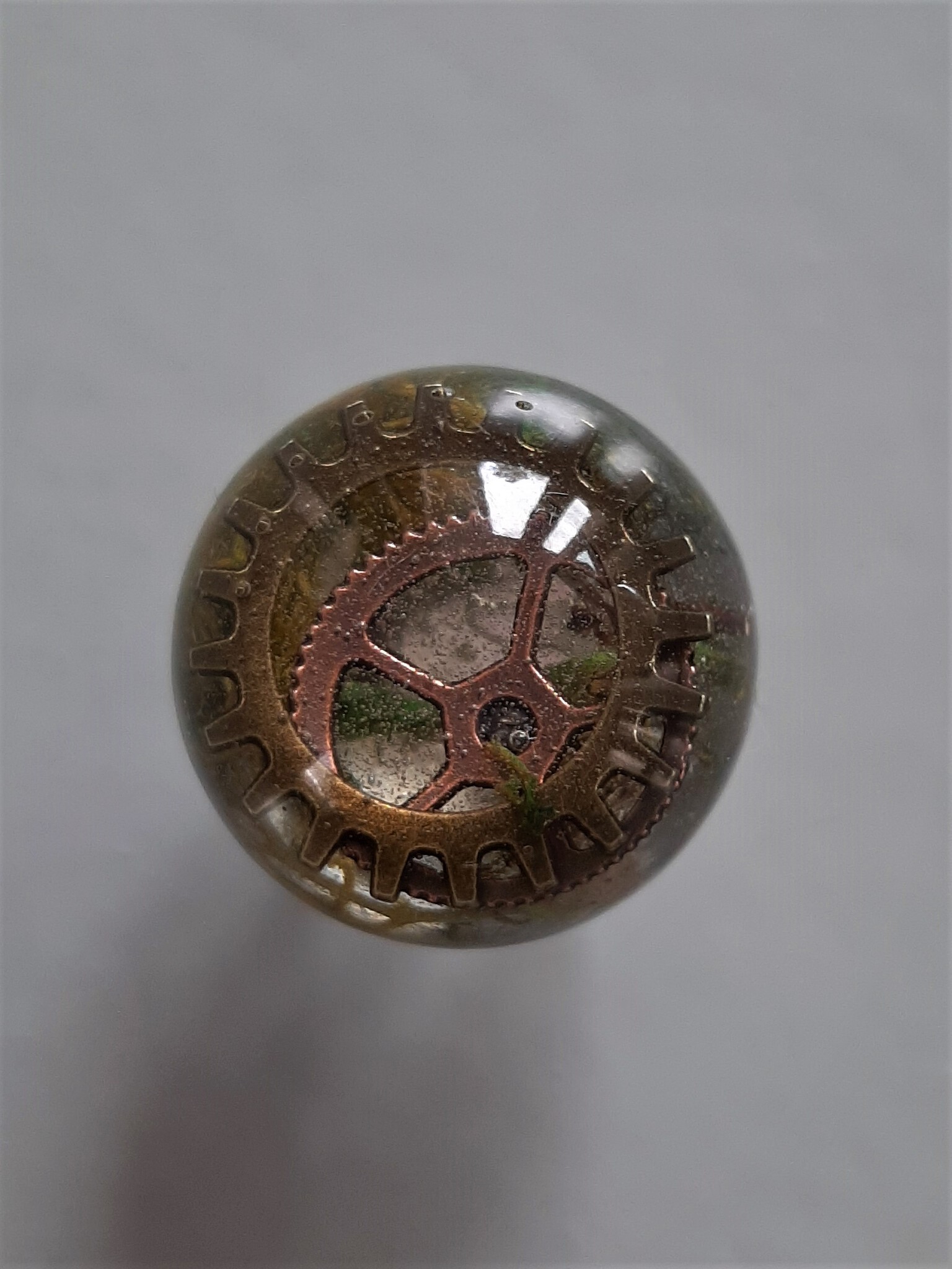 Steampunk ring, kunsthars met natuurlijk materiaal en tandwiel.