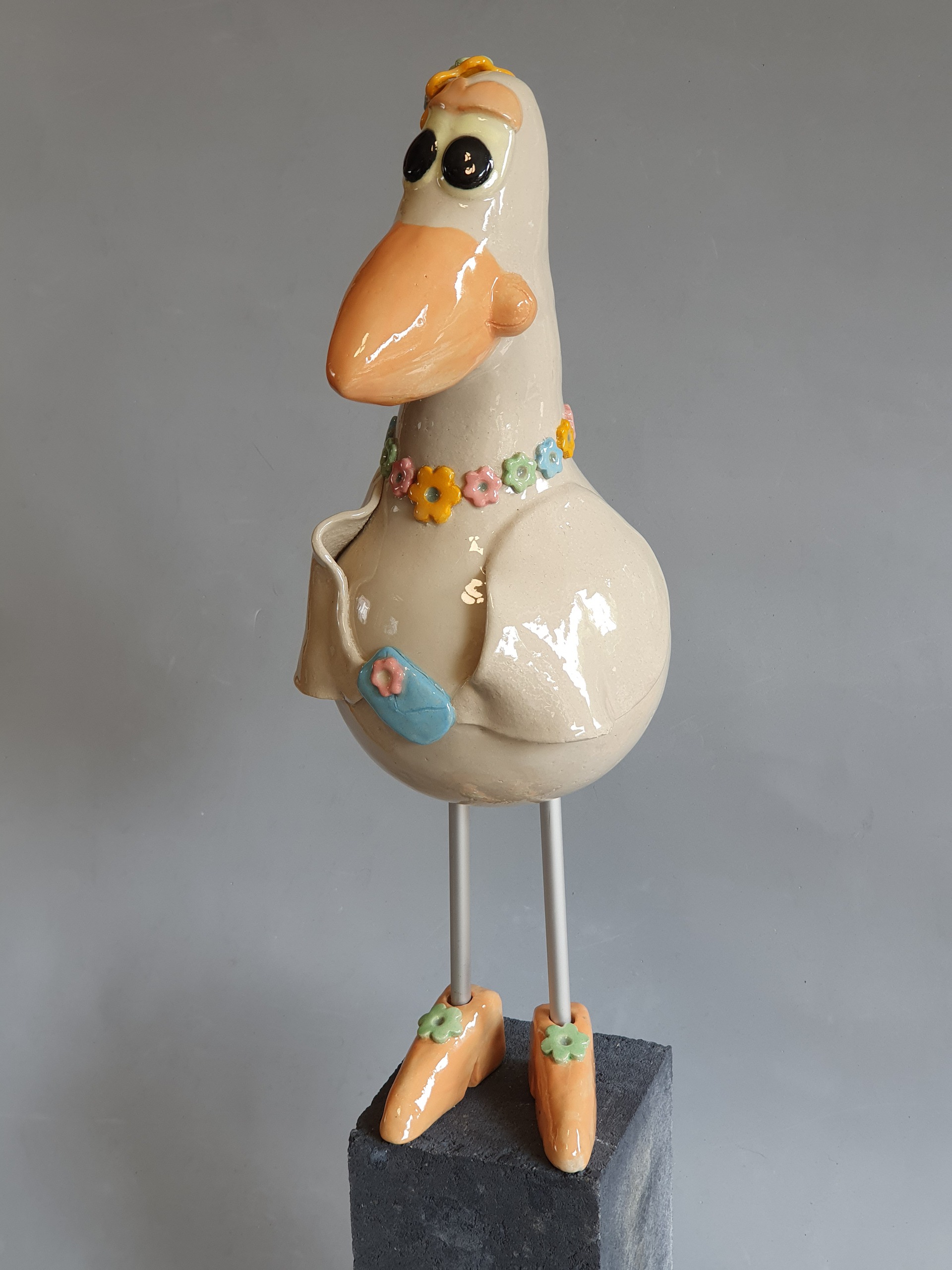 Vogeldame in keramiek. Deftige dame met halsketting, fascinator en handtas.