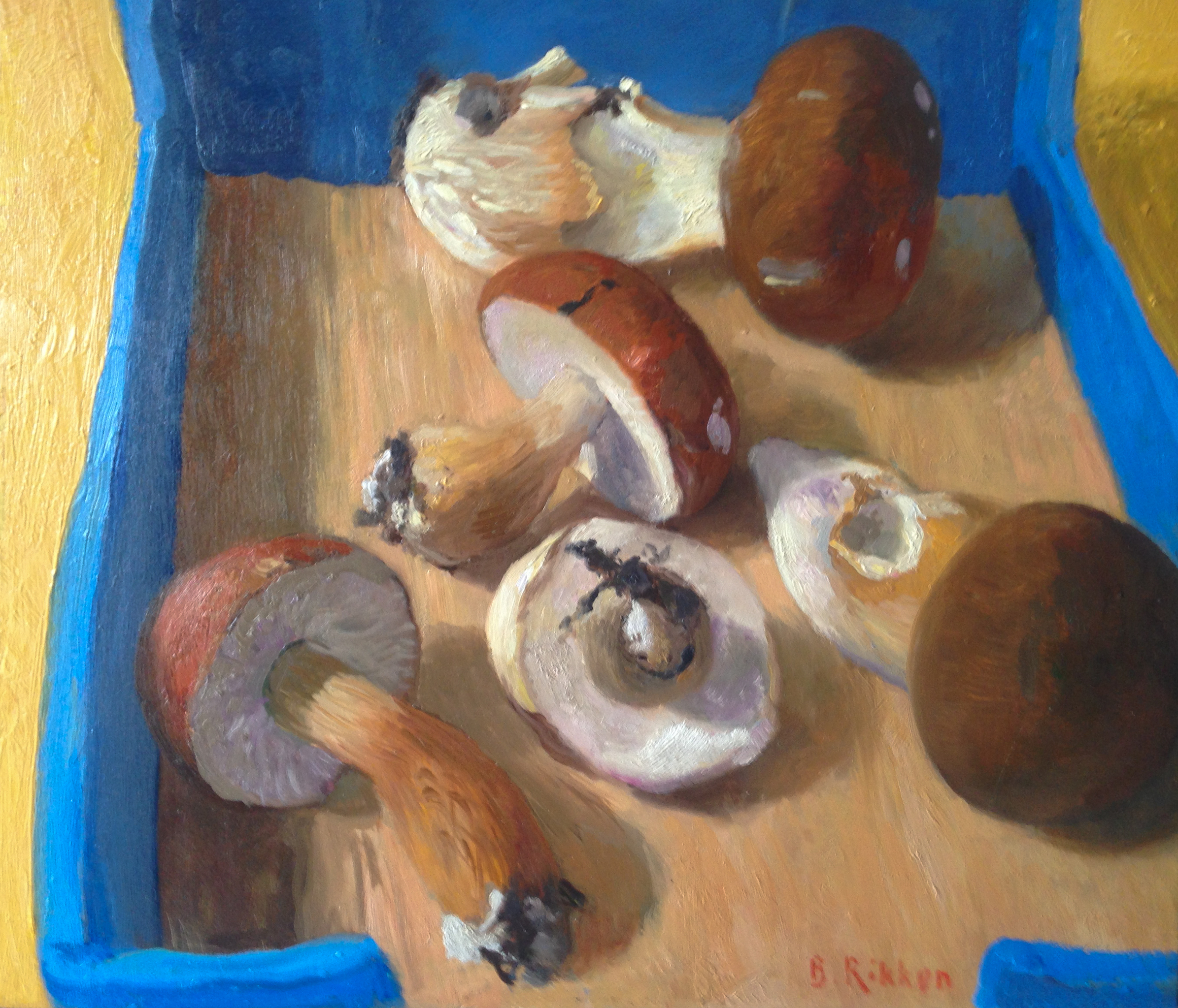 Dit stilleven is er een uit een serie over etenswaren, zoals : vlees, vis, groente, fruit .Wat me er in aantrekt is de schoonheid van het dagelijkse . De prachtige rood-bruine paddestoelen in de helder-blauwe kartonnen trays zoals je die op de markt vindt. In Italie worden ze vaak aan der kant van de weg uitgevent vanaf vrachtwagentjes die helemaal uit Zuid Italie komen aanrijden.De stofuitdrukking is natuurlijk een uitdaging voor een schilder als ik. Kijk ook eens op : https://www.benrikken.nl/stillevens