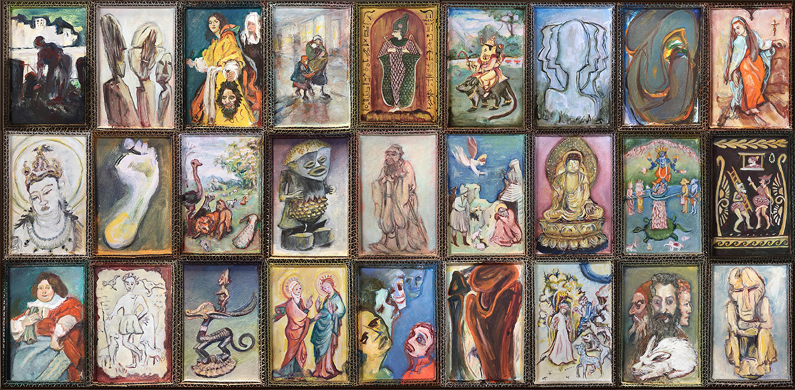 Installatie van impressies op miniatuur formaat van kunstwerken van mijzelf en mijn voorgangers in de kunst, De voorgangers zijn niet meer uitsluitend uit de westerse kunst, maar uit de gehele wereld.