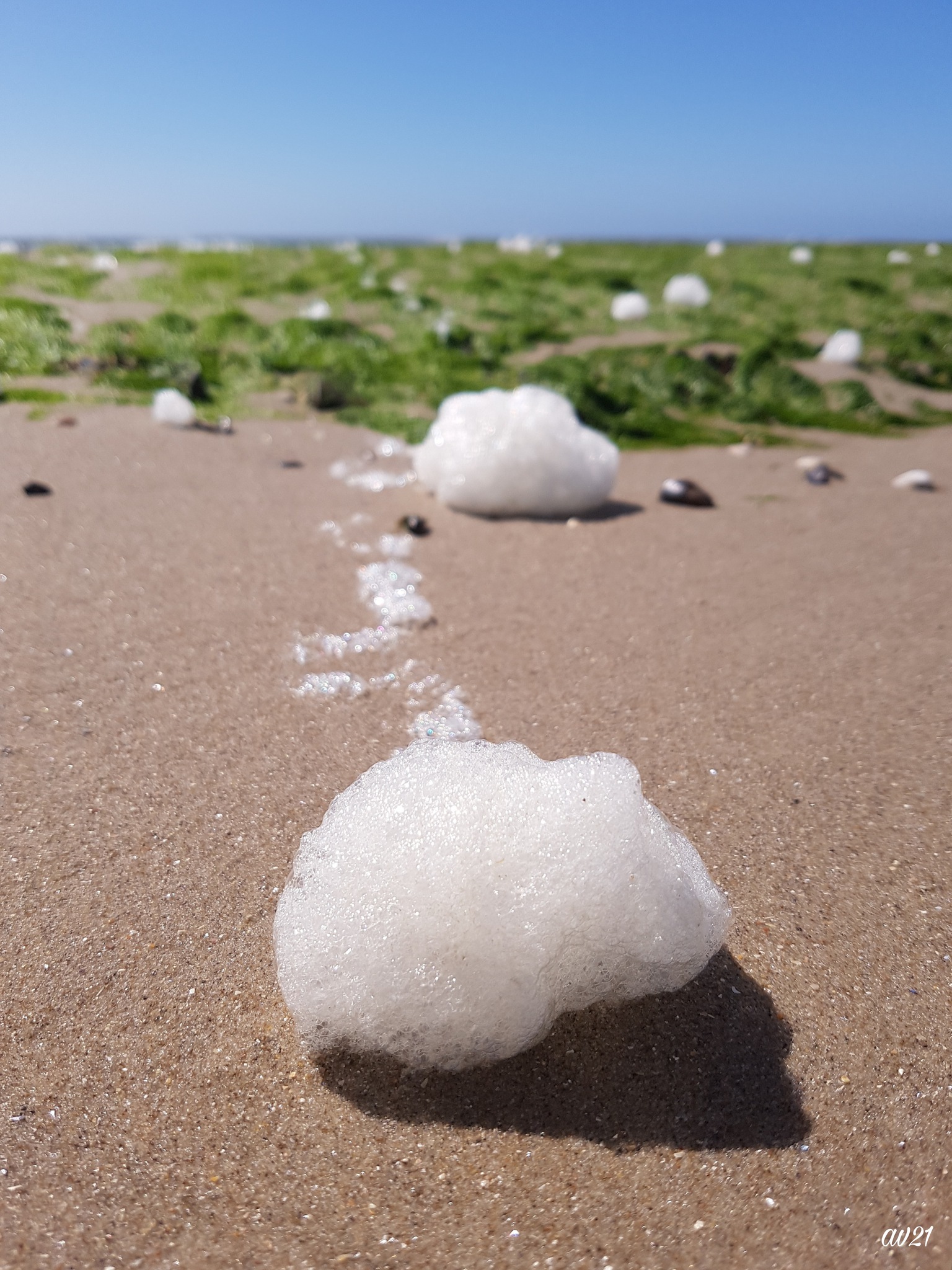 Schuimvlokken op het strand