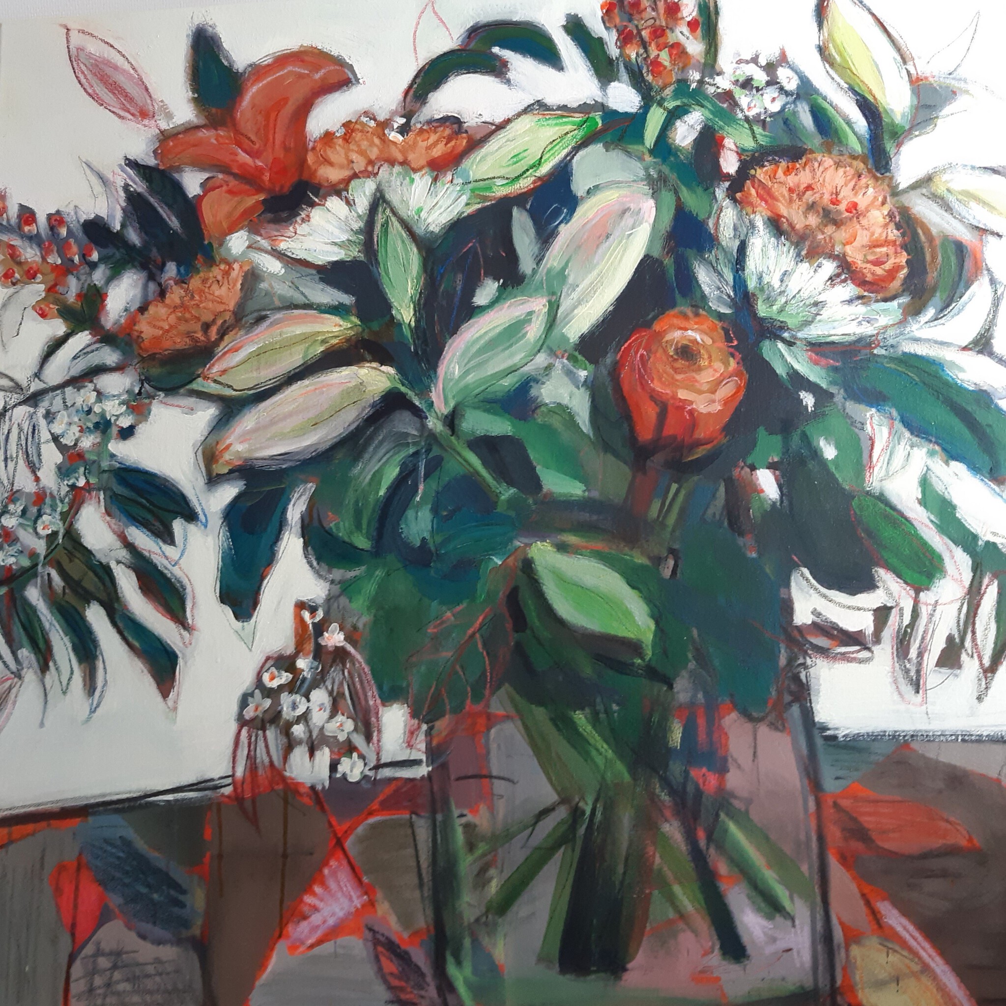 Bloemstilleven, expressief. Acrylverf en pastelkrijt op doek. Geïnspireerd door het voorbeeld van kunstenaar Lynn Whipple's "Big Bold Blooms" schilderde ik vanaf de zomer van 2019 tot ver in de winter (januari 2020) verschillende doeken met boeketten. Die winter was mijn kleine studio gevuld met een enorme bos bloemen - die ik schilderde uit verschillende hoeken. Vertoond in de tentoonstelling in voorjaar 2019, buurthuis De Musketon, Lunetten.
