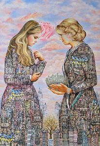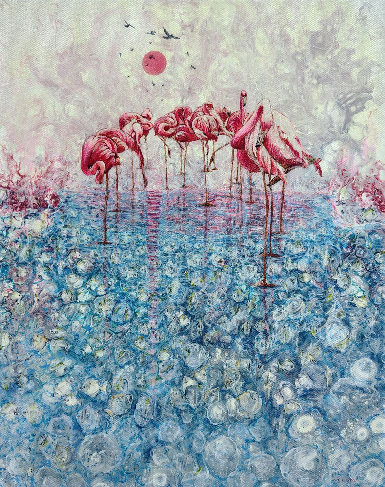 Een tuin van kleur, een blik vol verbeelding. Haar werk ademt een poetische zachtheid, maar ook lef: ze experimenteert graag met bladgoud, olieverf en gemengde technieken.