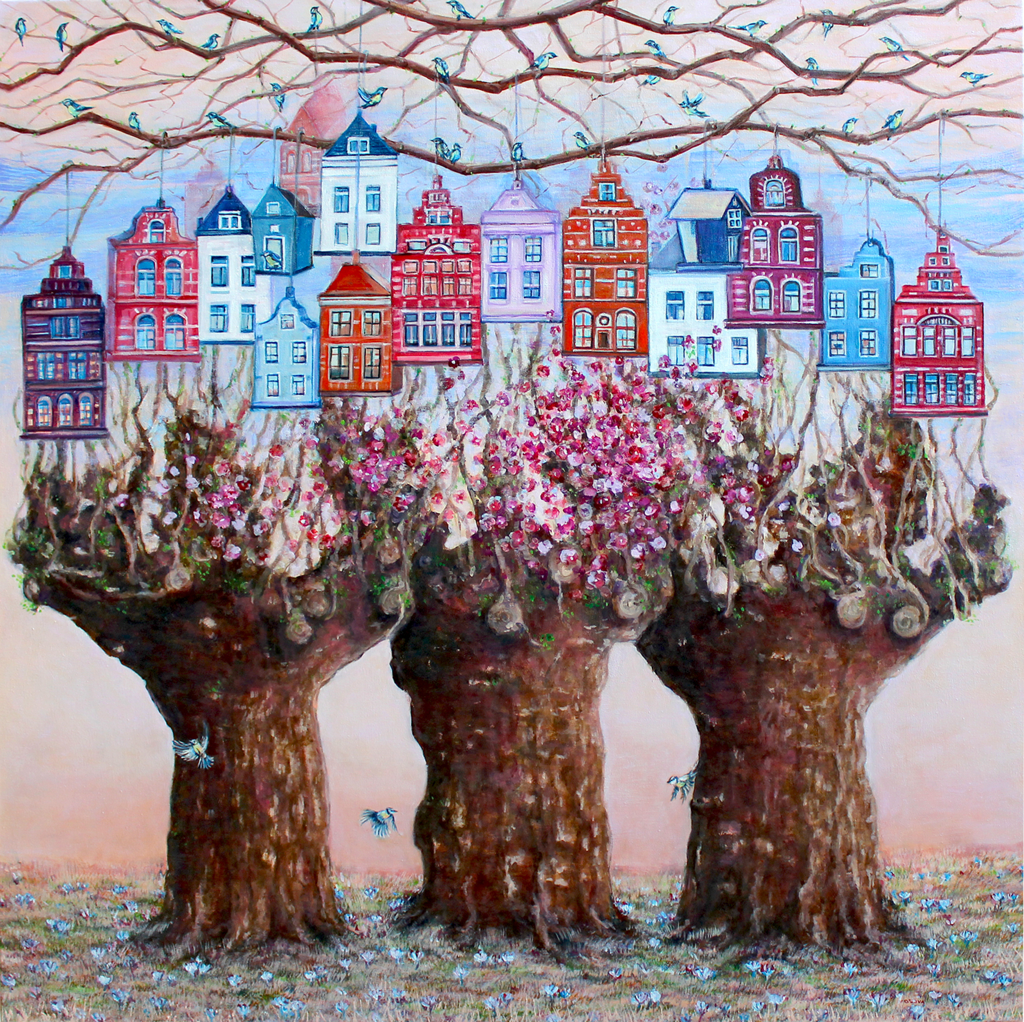 Een tuin van kleur, een blik vol verbeelding. Haar werk ademt een poetische zachtheid, maar ook lef: ze experimenteert graag met bladgoud, olieverf en gemengde technieken.