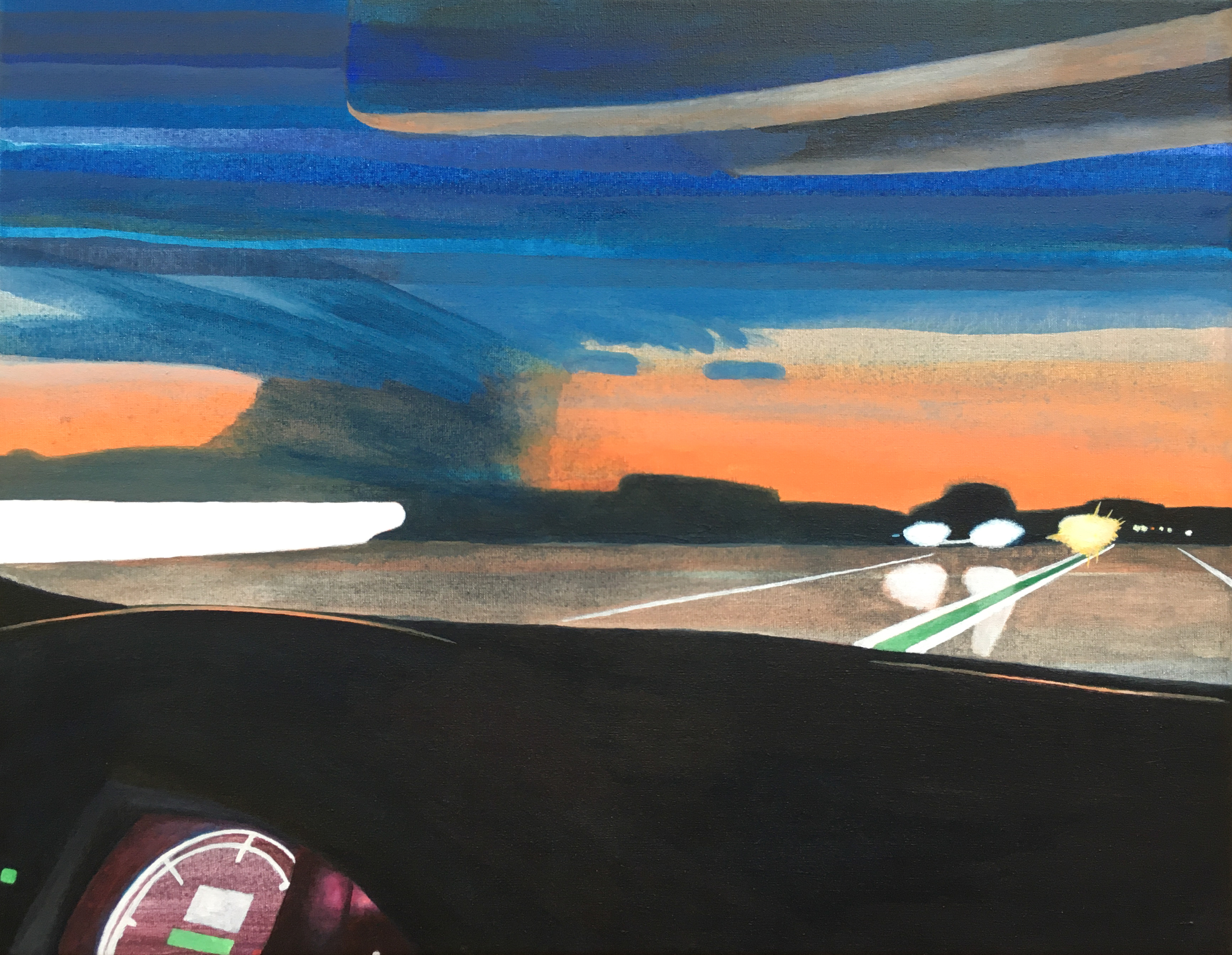 Schilderij Landschap Acryl Sunset Zonsondergang Painting Avondlucht Auto Weg Reizen Onderweg Highway Eveningsky Passagier Cartrip
