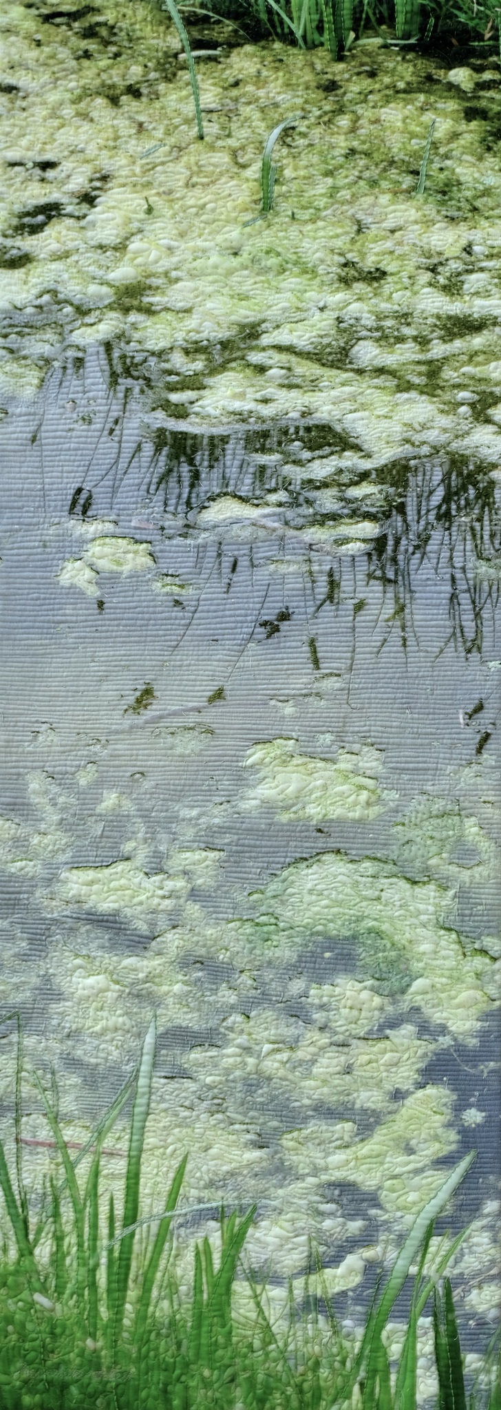 Textielkunstwerk. Reflectie van riet in een sloot met kroos. Stikwerk en handborduren. Relief