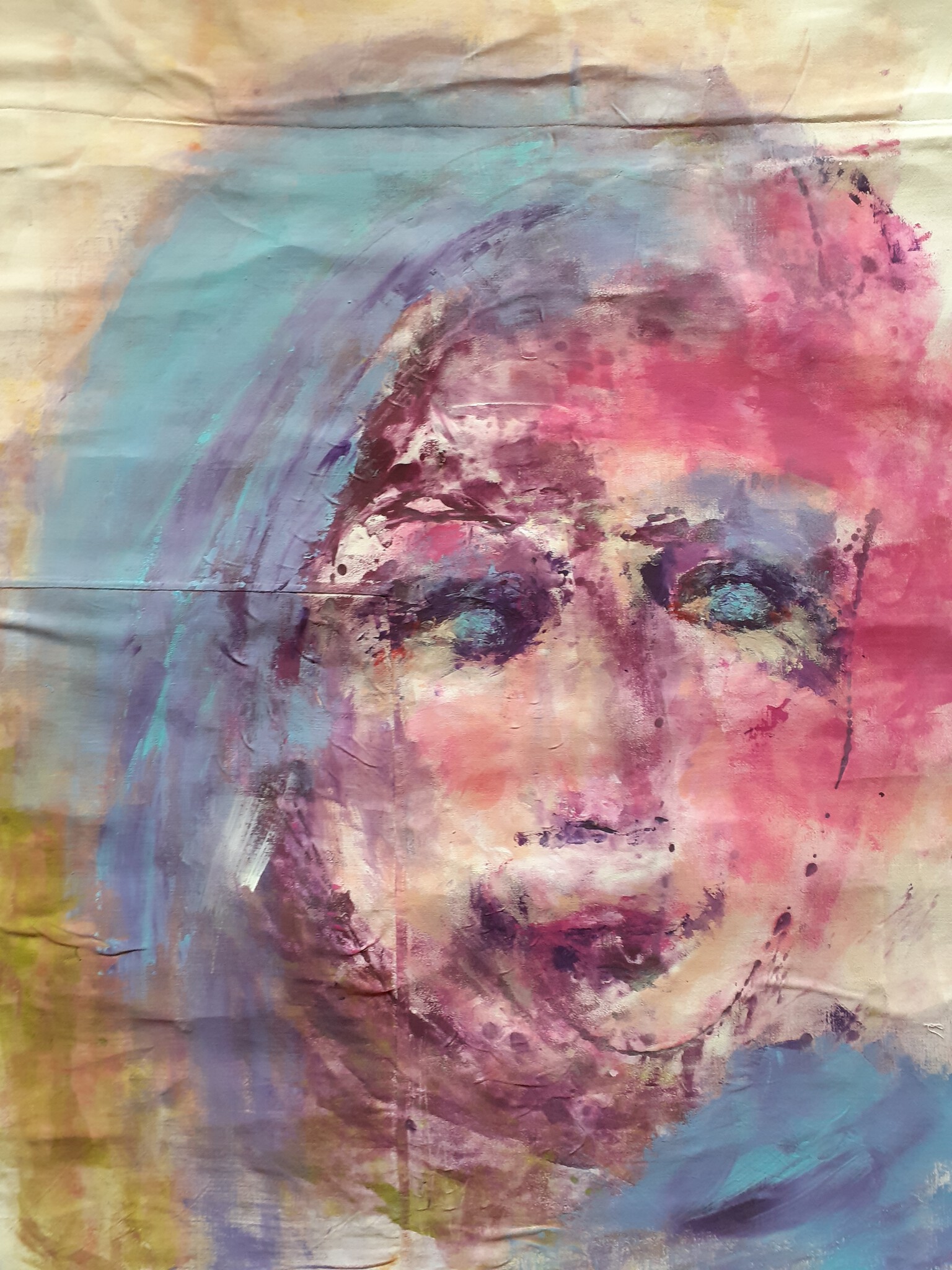 Expressief portret, geschilderd op een oud laken.