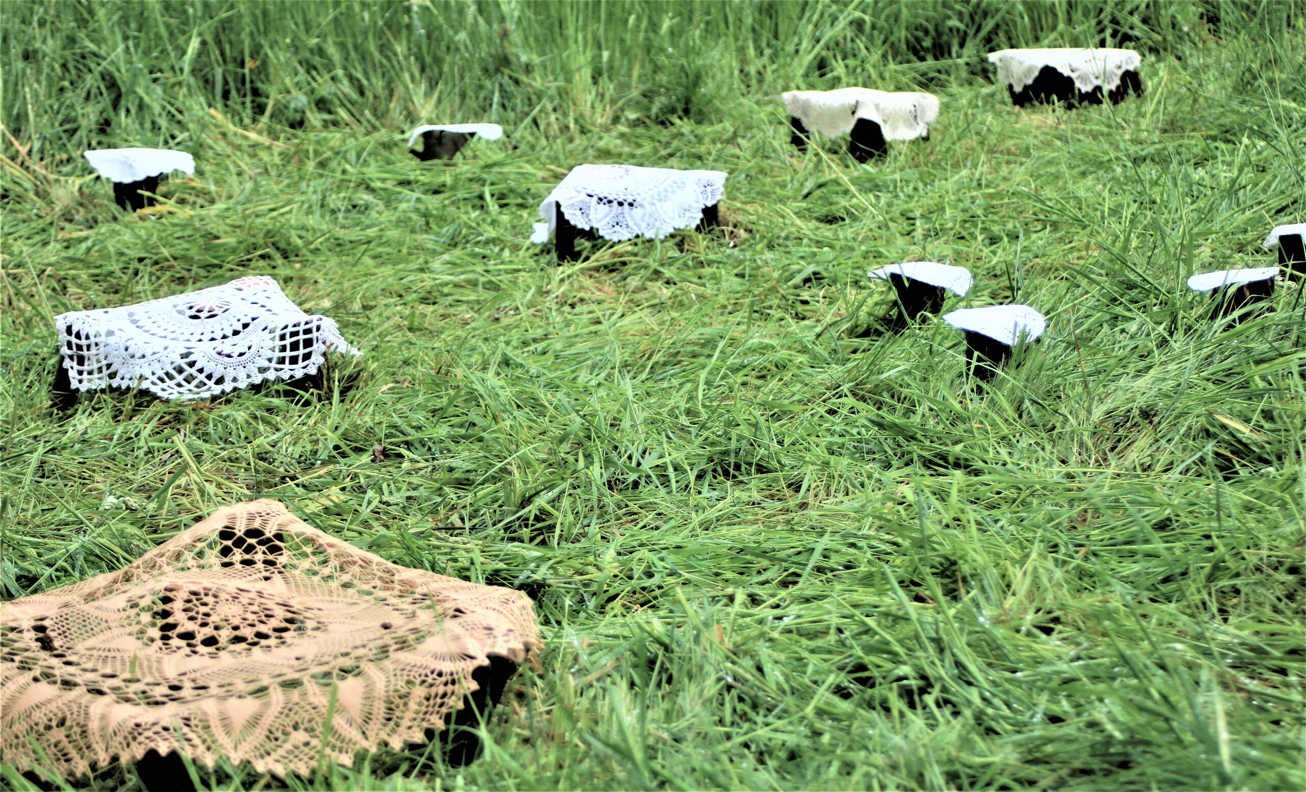 Installatie in opdracht van Textielfestival Twente 2021. 'Vrouwenhanden' komt voort uit de herinnering aan mijn moeder en grootmoeder. Ik zie hun handen met een extreem dunne haaknaald en fijn garen in de weer. Ze waren fier op de kleedjes die zo uit hun handen ontstonden en verschillende goed zichtbare plekken in huis tooiden. Hun 'erfenis' bestond uit een aantal van die kleedjes die ze met engelengeduld hadden gehaakt. In later jaren begreep ik dat mijn herinnering niet uniek is. Veel mensen hebben vergelijkbare herinneringen aan hun moeder, grootmoeder, buurvrouw, tante. Ik verzamelde een groot aantal van dit soort kleedjes. In kloswerk, haakwerk, naaldkant. Gemaakt door vele moeders, grootmoeders, buurvrouwen, tantes. Ze komen uit allerlei persoonlijke erfenissen en dragen zo een stukje persoonlijke geschiedenis van de schenkers. In de installatie 'Vrouwenhanden' til ik deze kleedjes één voor één op en plaats ze op een sokkeltje. Zo gaan ze een eigen leven leiden. Los gekomen van het tafeltje, de rookstoel of het dressoir waar ze ooit voor werden vervaardigd. Door hun opstelling in het rond kun je er omheen en tussendoor lopen. Omringd door de geschiedenis van onze handwerkende 'voormoeders' en de producten van hun werk. De tijd en het engelengeduld dat onze 'voormoeders' investeerden in deze werken komt terug op de plek waar het hoort: losgemaakt uit de vergetelheid, geplaatst op sokkeltjes, opgesteld in de natuurlijke omgeving van Twente. Een stukje erfgoed maken ze zichtbaar.